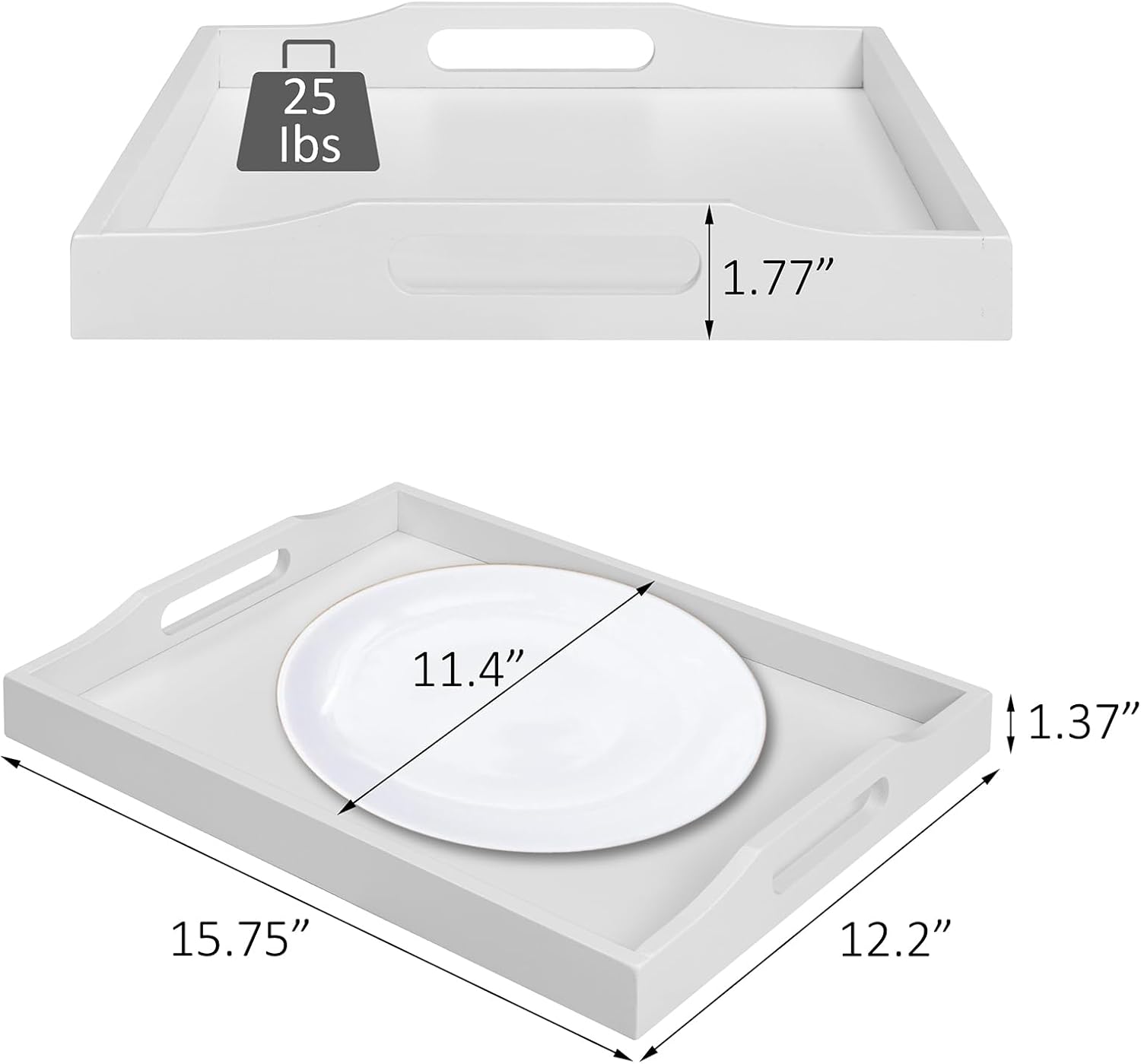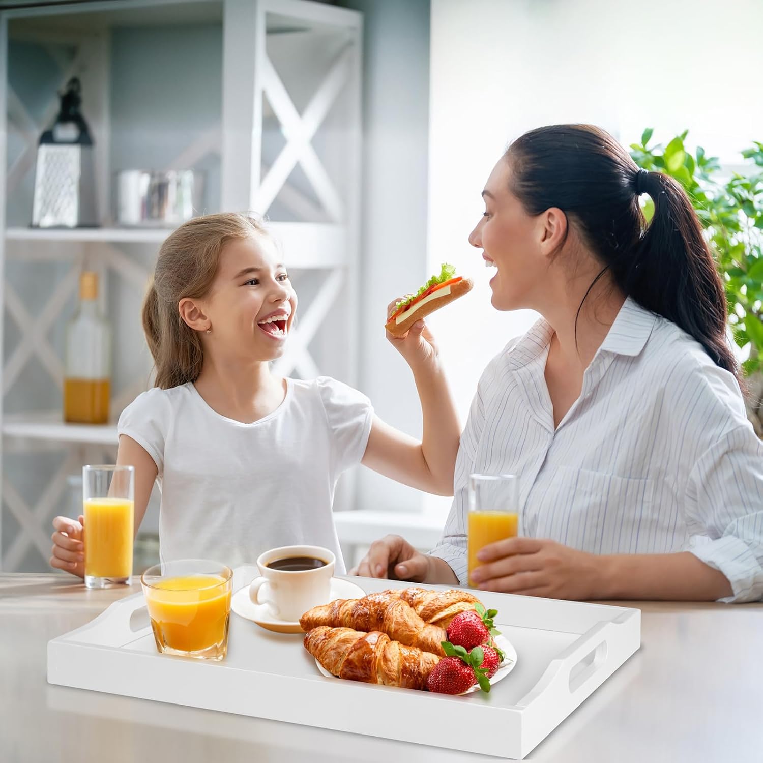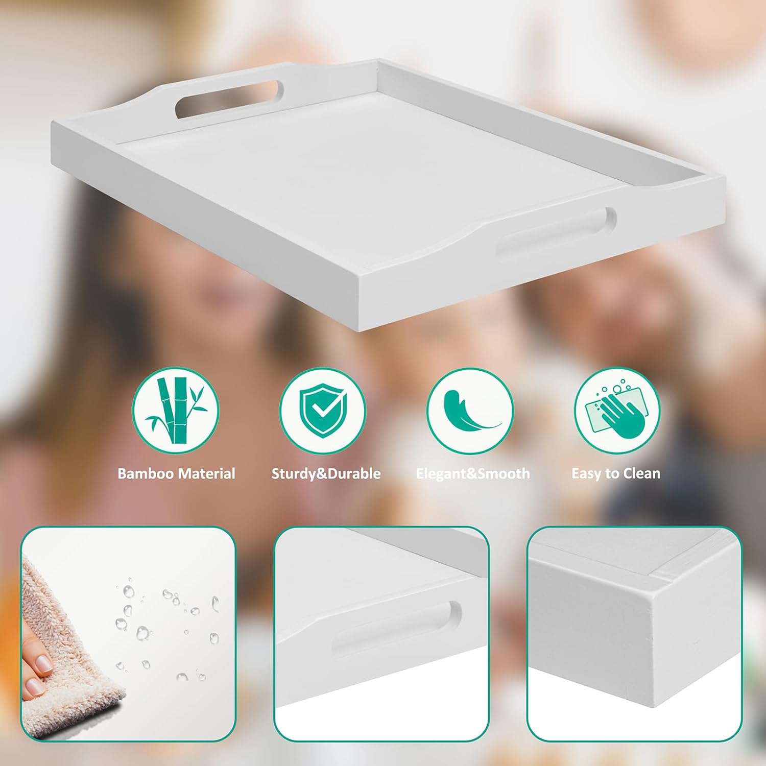 Bamboo Food Serving Tray with Handles, Breakfast Bed Tray for Tea,Snack,Dinner, Home Decorative Storage Food, Platter, Ottoman for Kitchen Counter, Bathroom, Restaurant (White)