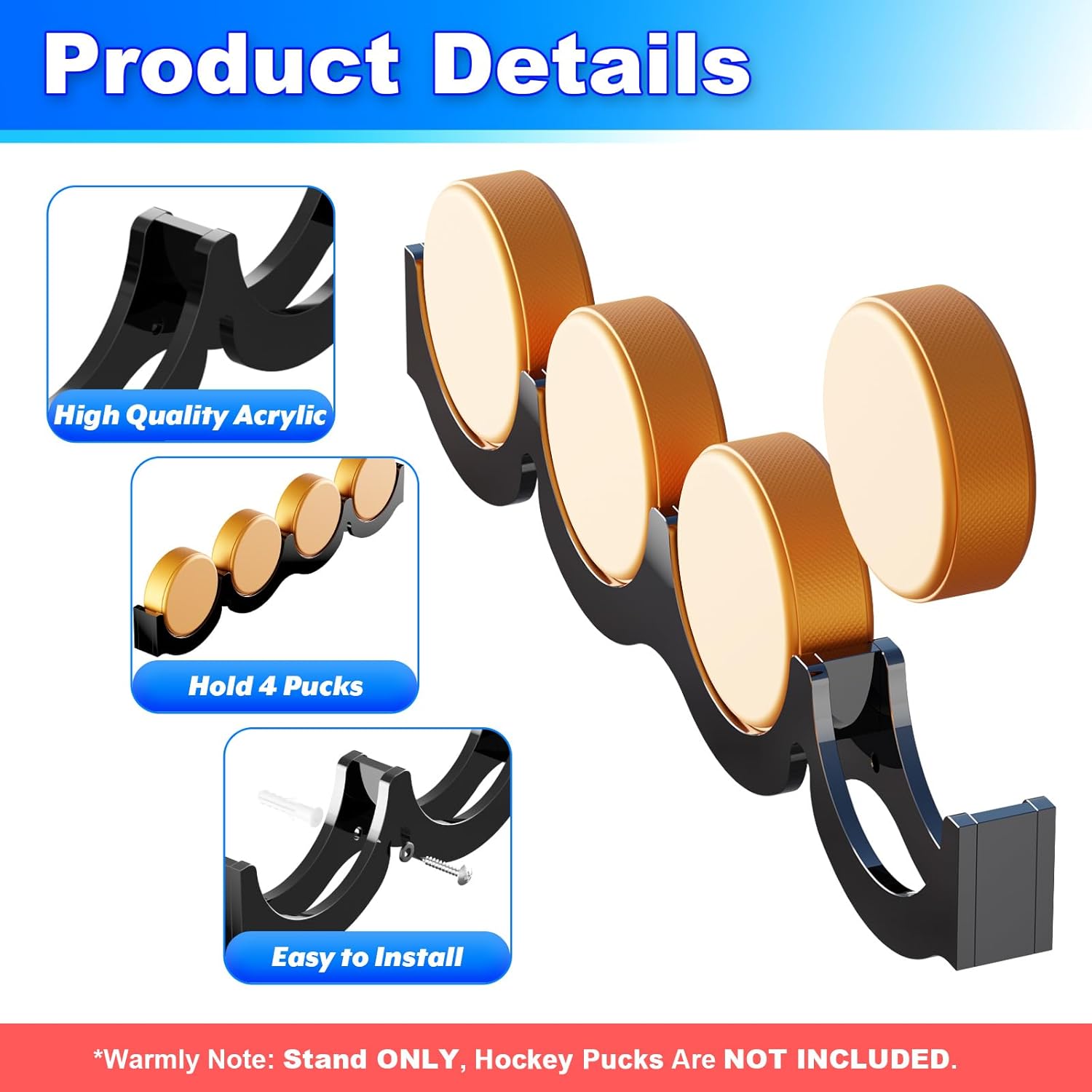 - Acrylic Hockey Puck Display Case: Designed with a stylish wave shape, the puck wall rack holds 4 standard size pucks for displaying your hockey pucks collection or memorabilia on the wall. NOTE: Hockey pucks are not included