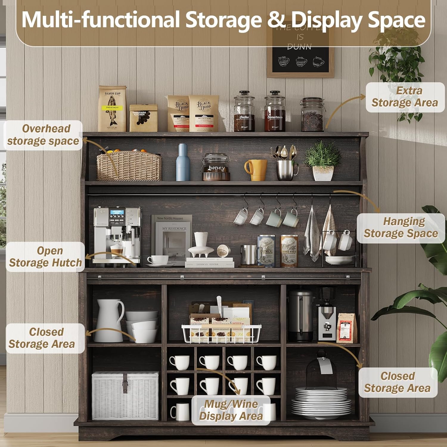 - [Multifunctional Storage Design] The coffee cabinet features 12 wine racks, 3 glass holders , 6 hooks to store and display wine utensils/coffee cups/tea sets, creating a warm family coffee bar and wine bar