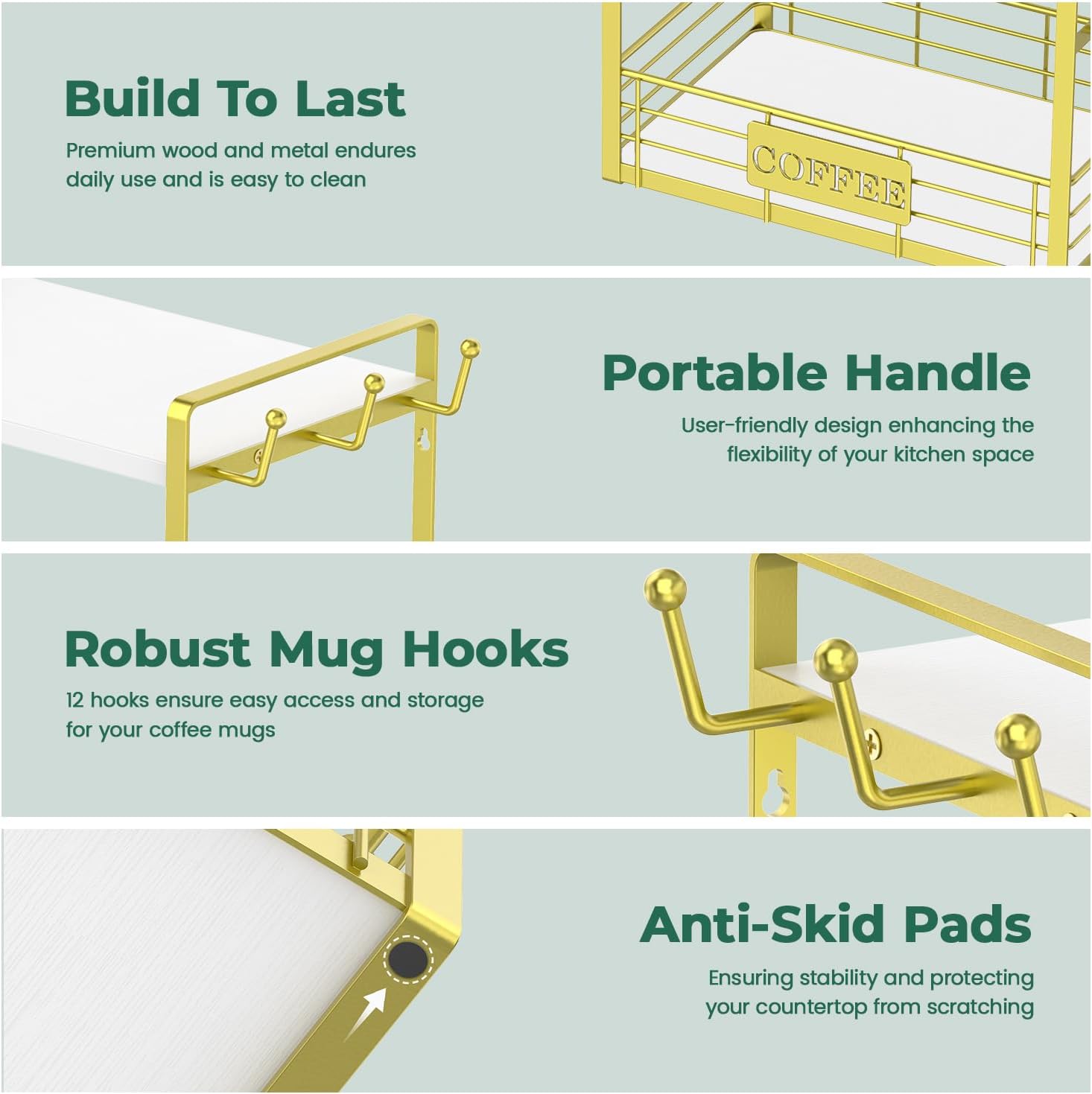 EsLuker.ly Coffee Mug Cup Holder Tree Bar Station Organizer, 2 Tier Mug Stand Rack for Countertop Kitchen, Storage Tower Display Shelf with 12 Hooks, Coffee Nook Enhancer, White-Gold