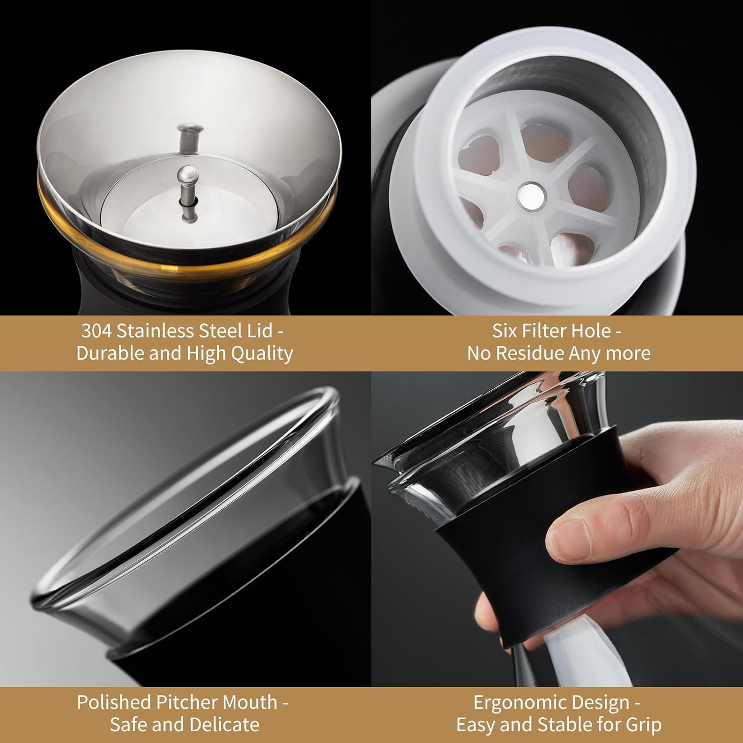 - High Borosilicate Glass: The water pitcher is made of heat resistant Borosilicate glass and can Two Different Pour Functions: The iced tea pitcher comes with premium 304 stainless steel lid that has 2 different pour functions, one with tiny holes to act like a strainer to keep ice or fruits inside pitcher when pouring and 180 degree turn of the cap provides a “wider” mouth. The lid also has a silicone ring that improves sealing performance and reduces leaks or spills.