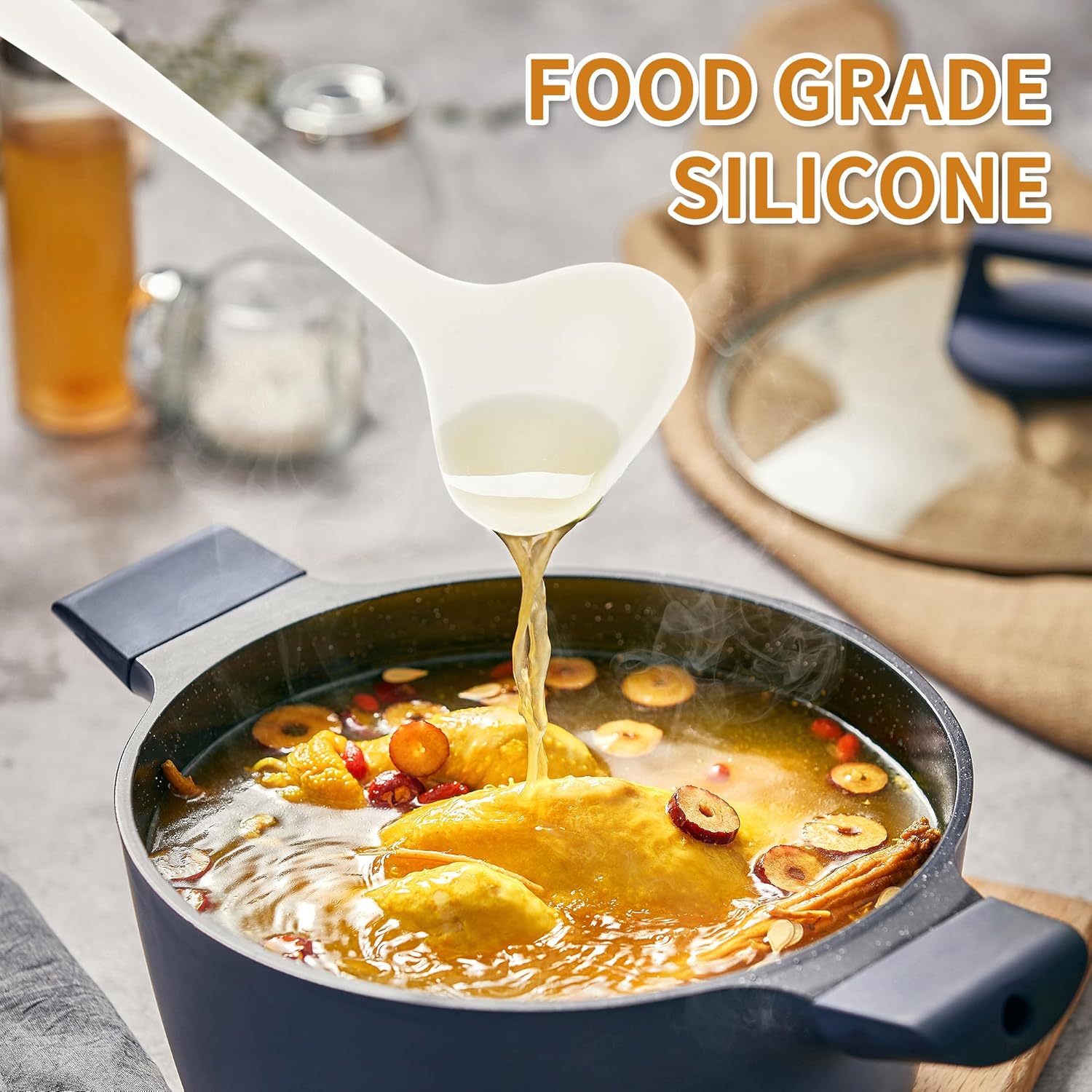 - ESSENTIAL KITCHEN TOOLS: Include Slotted spoon, Solid spoon, Soup ladle, Slotted turner, Solid turner, Spaghetti spoon, Spatula, Tongs, Whisk, Silicone mat, Basting brush(ALL Silicone) + Plastic Egg separator and Measuring spoon. Meet all kinds of kitchen needs. From beginners to skilled cooks.