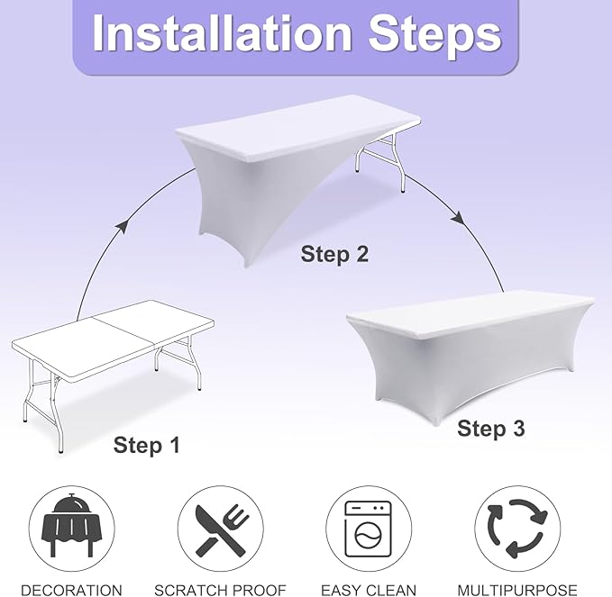 - 3.Which One Should You Choose?: Whether you're using for everyday use in your home or in commercial establishments such as restaurants, hotels and cafes. Our inexpensive rectangle spandex table covers which have the size of 4FT, 5FT, 6FT, 8FT and multicolor will match your table and decor perfectly. Table covers in multipacks are even more cost effective because after taking into account the cost of packaging and transportation.