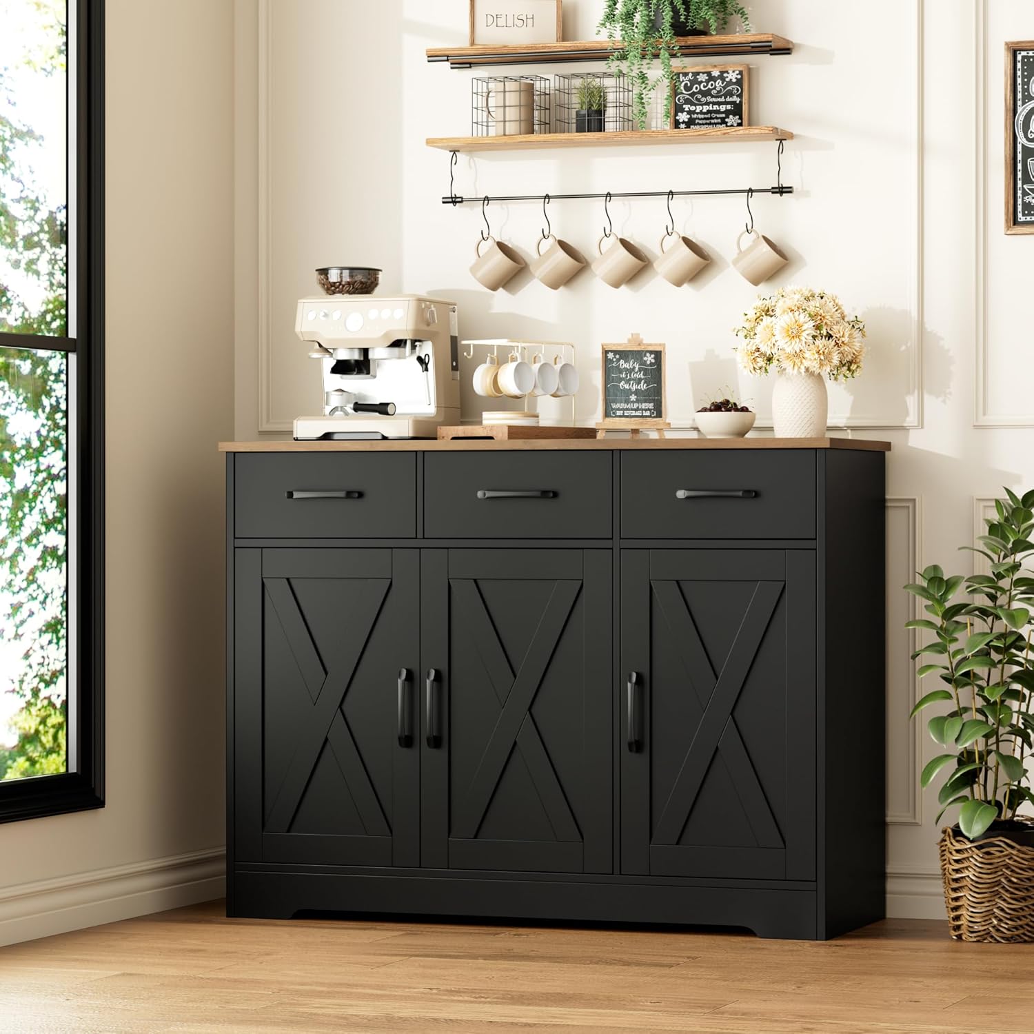 HOSTACK Modern Farmhouse Buffet Sideboard Cabinet, Barn Doors Storage Cabinet with Drawers and Shelves, Wood Coffee Bar with Storage for Dining Room, Kitchen, Living Room, Black/Rustic Brown