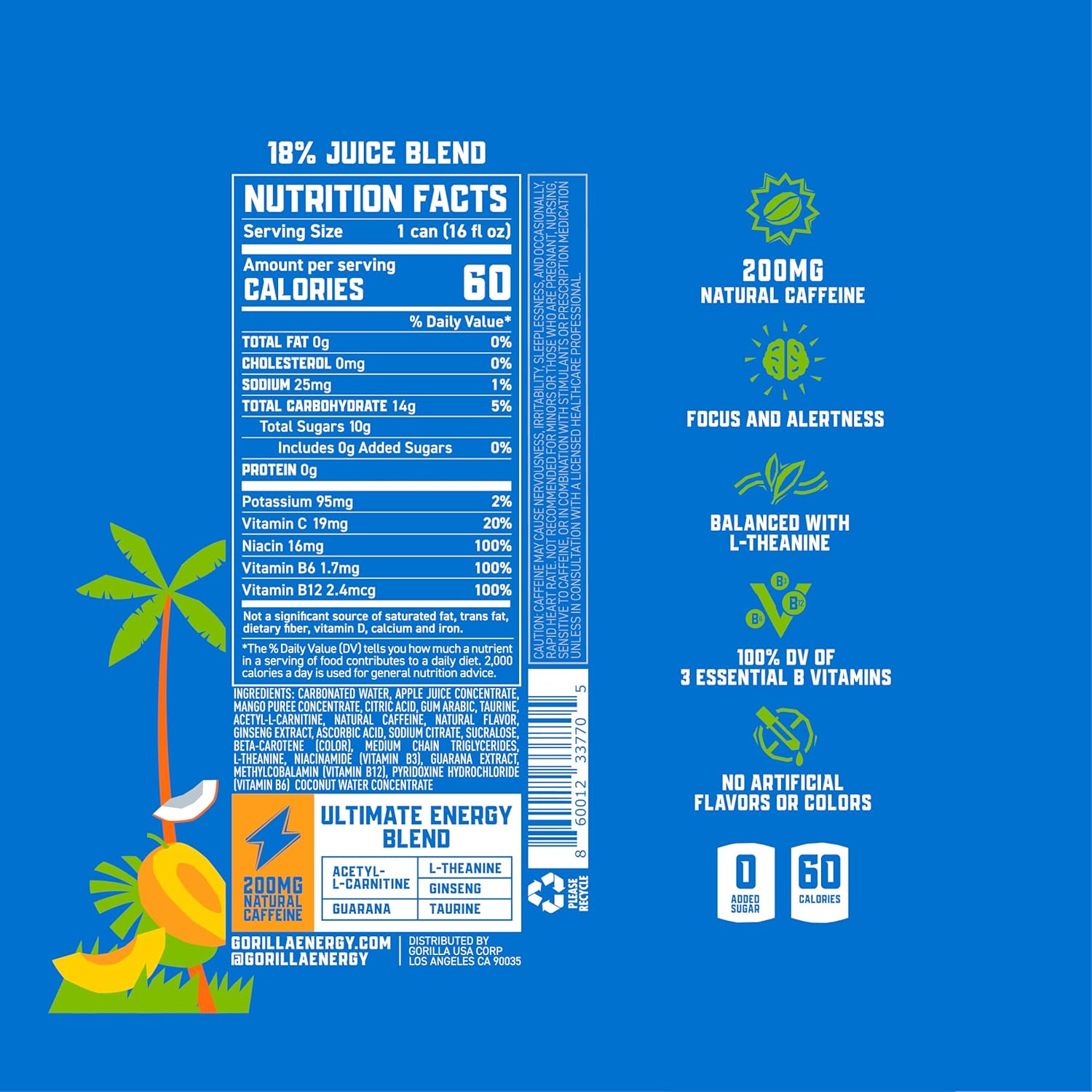 Gorilla Energy Drink, Mango Coconut, 200mg Natural Caffeine, Real Fruit Juice Squeezed & Concentrated, L-Theanine, Taurine, Ginseng, Acetyl L-Carnitine, No Added Sugar and No Artificial Colors, 12 Pack