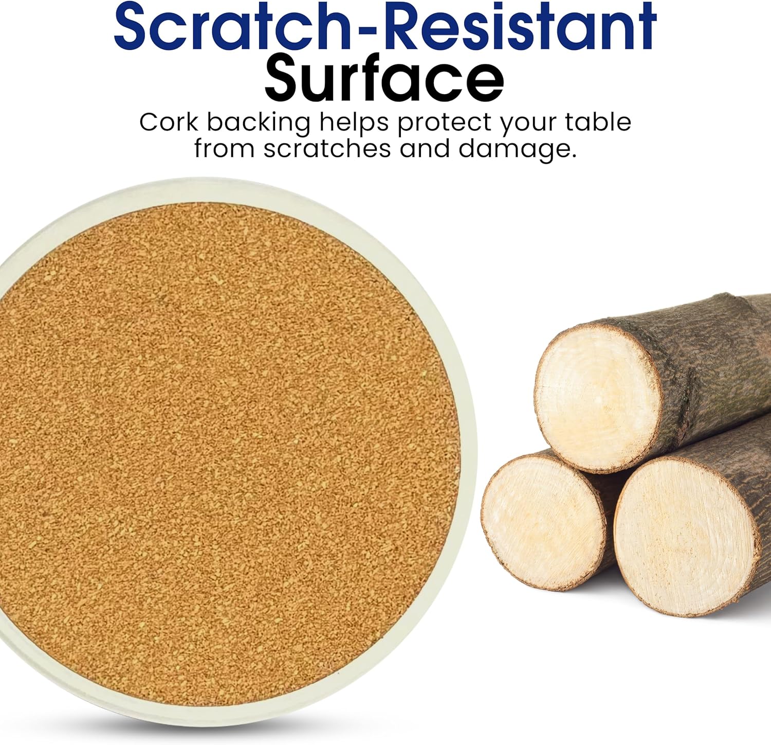 - Cork-Backed for Surface Protection – Each coaster in this coaster set features a cork backing that prevents sliding and safeguards your table from scratches, making them perfect for protecting delicate surfaces.