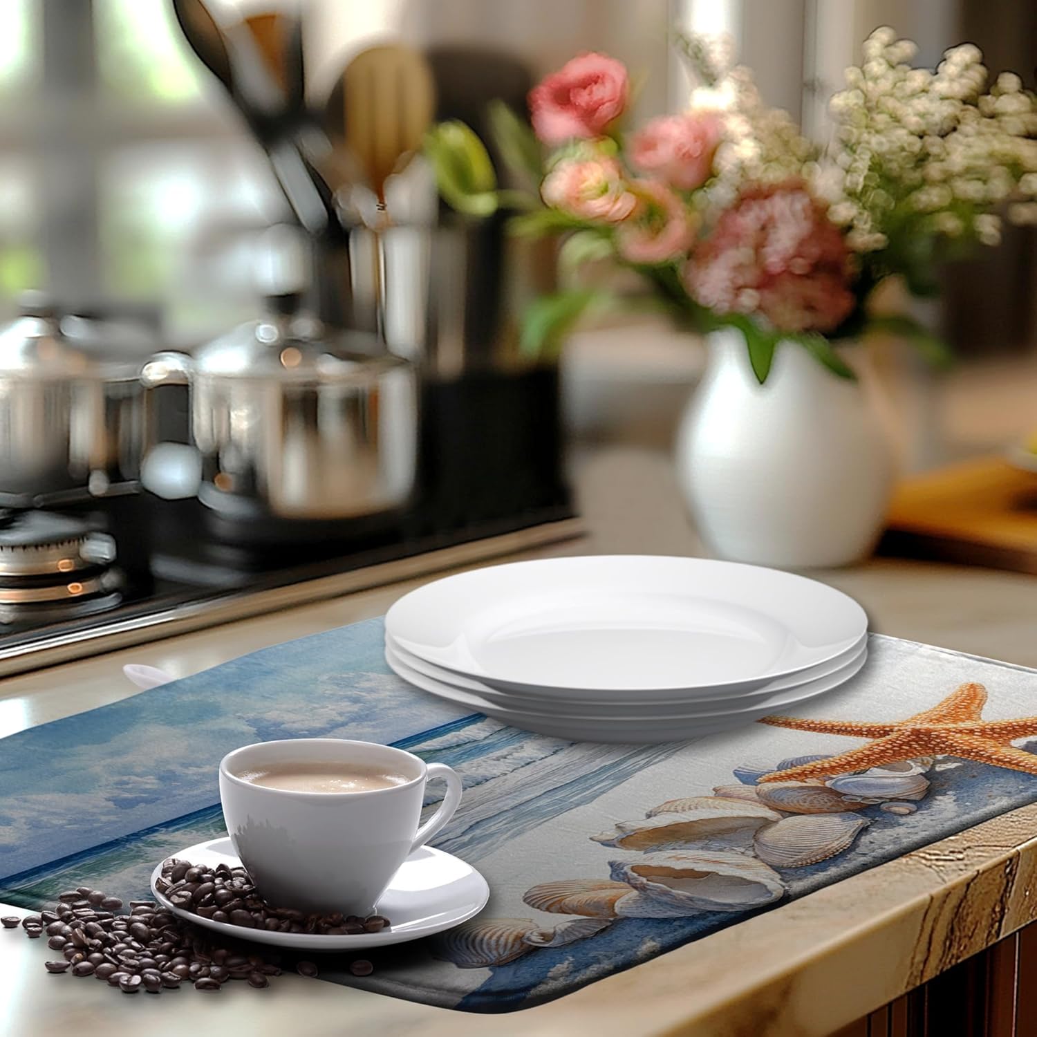 - [Quick Absorption]: Made of absorbent material,our Summer Beach Starfish Coastal Shells dish dryer mat for kitchen absorbs water stains quickly, keeping your table top dry and clean, avoiding water stains and leaks, providing you with a pleasant and dry dining or working experience.