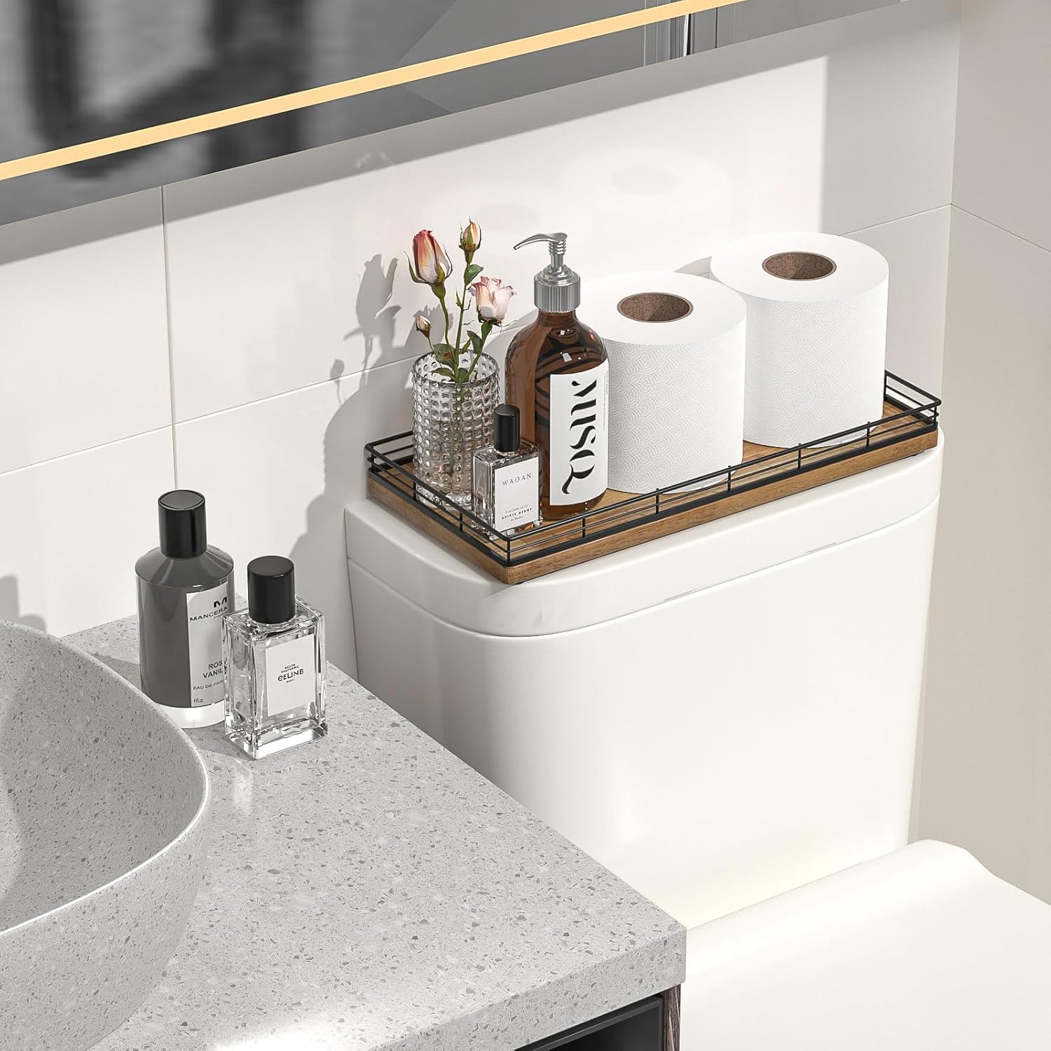 - Versatile Functionality: Elevate your daily routine with our toilet tank basket tray; Neatly arrange bathroom essentials such as toilet paper, lotions, scented candles and potted plants, keeping your countertop tidy; Add a touch of elegance to your dresser by using the bathroom vanity tray to display perfumes, jewelry, and cosmetics; Impress your guests with neatly arranged hand towels and toiletries organized on the large toilet tray for bathroom counter or use it as a kitchen soap tray