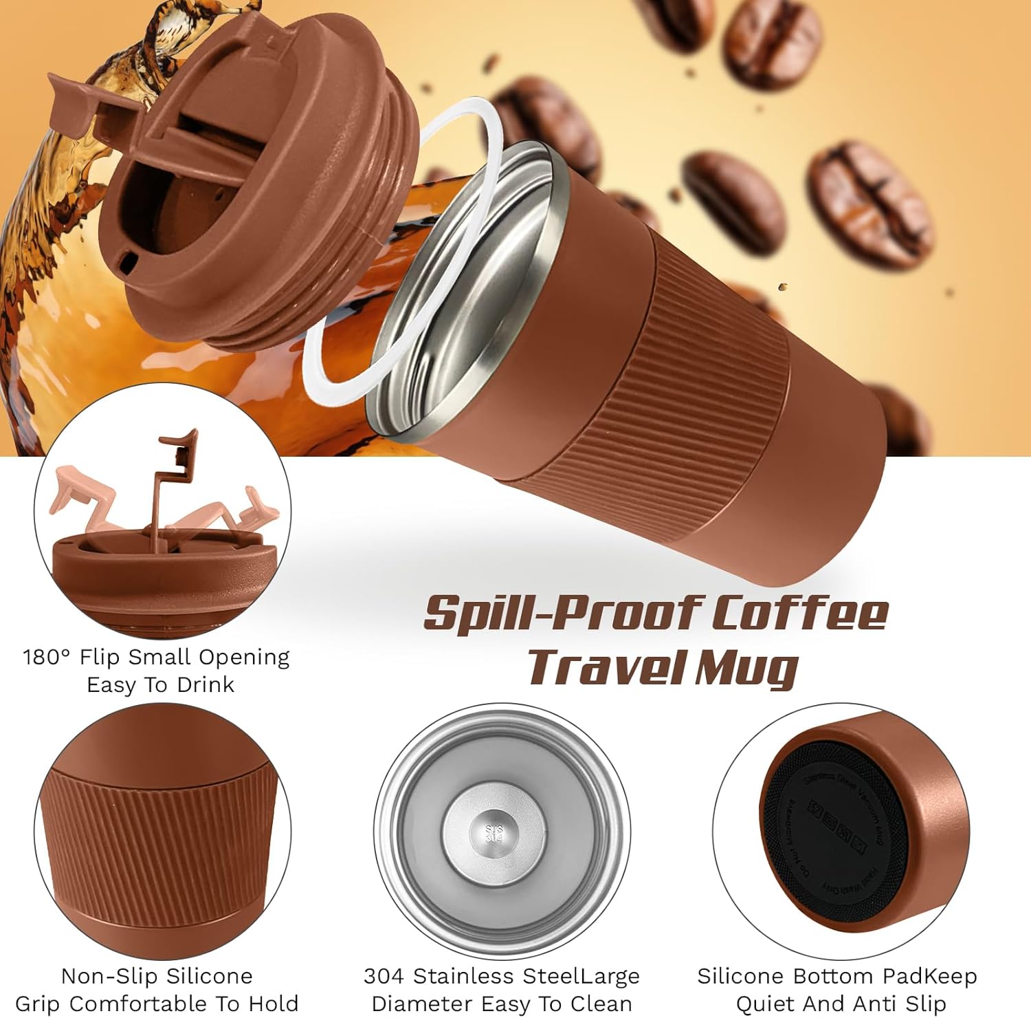Vacuum-Insulated Stainless Steel Travel Coffee Mug, Leak-Proof Reusable Coffee Cup with Lid - Keep Hot & Cold Drinks for Hours, Durable Thermos Tumbler for Men & Women (3rd-Light Coffee, 12OZ)