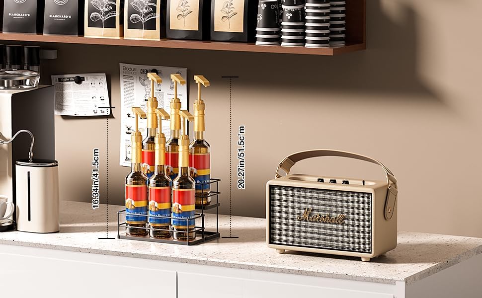 - ·【Versatile and Easy to Maintain】🏠- Beyond coffee syrups, use this rack to neatly store cooking spices, condiments, mugs, or decorative items. The smooth metal finish makes cleaning a breeze with just a damp cloth.