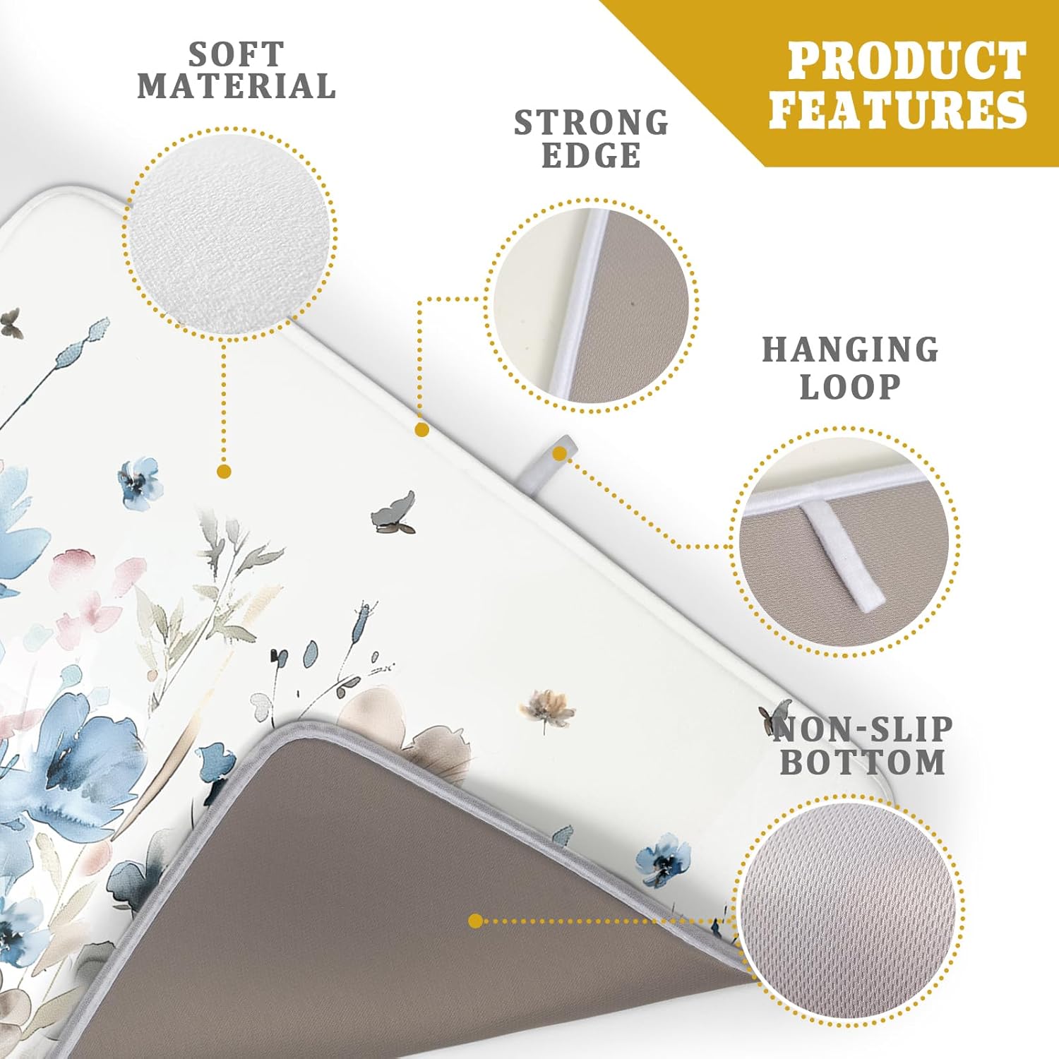 - ❀ 【SPECS & WATERPROOF BACKING】 Made of absorbent fabric, this 3-ply polyester provides a soft cushion. 24" X18", fitting most counters snugly while providing a smart and sharp look, a gorgeous decoration for kitchen. Moreover, the waterproof backing stops liquids from soaking through, damaging or staining the surface below and allows moisture to evaporate quickly at the same time.