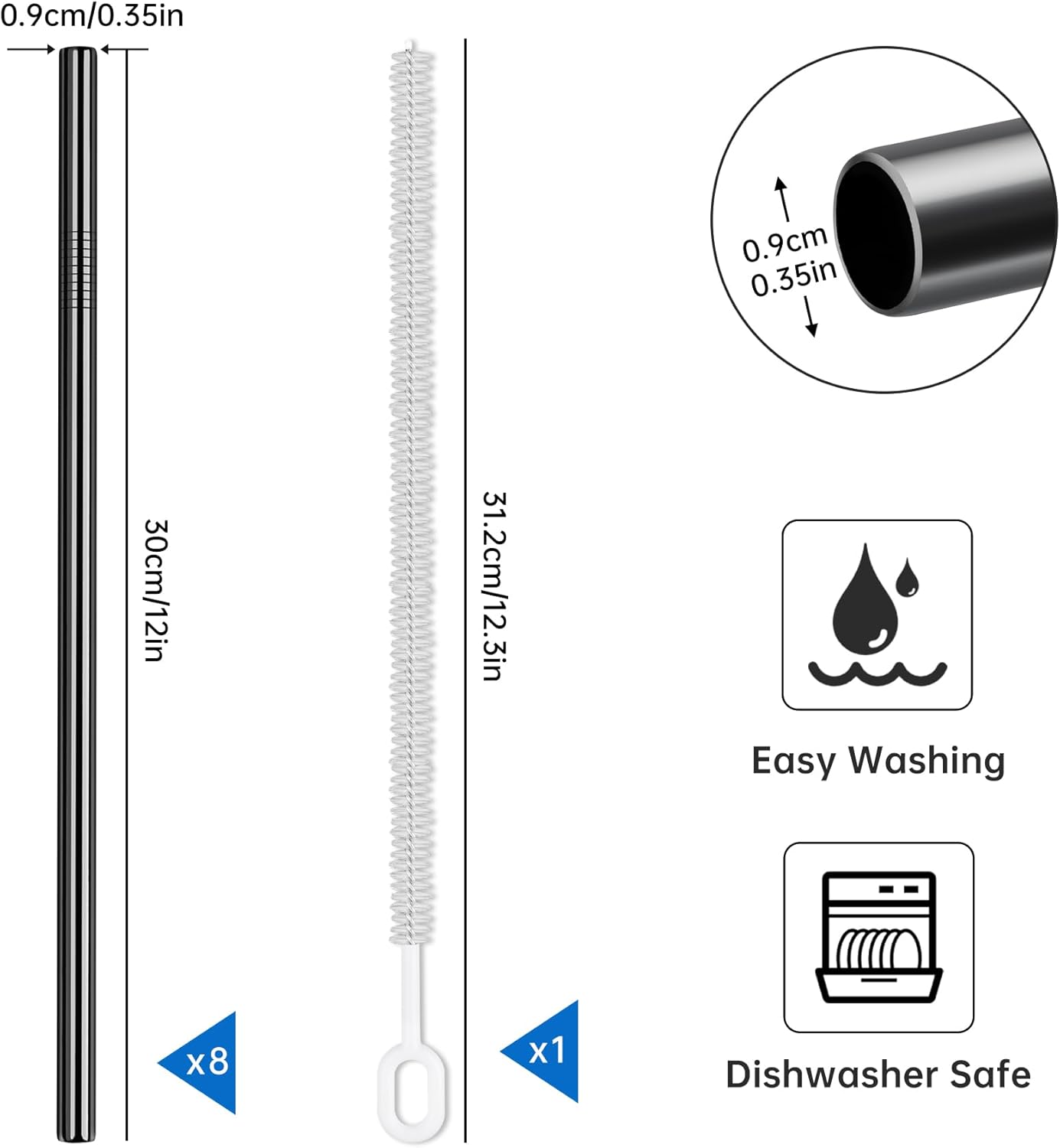 - Value Set: Includes 8 reusable extra-long metal straws (12" x 0.394") and 1 bonus cleaning brush—perfect for home, travel, and daily use.