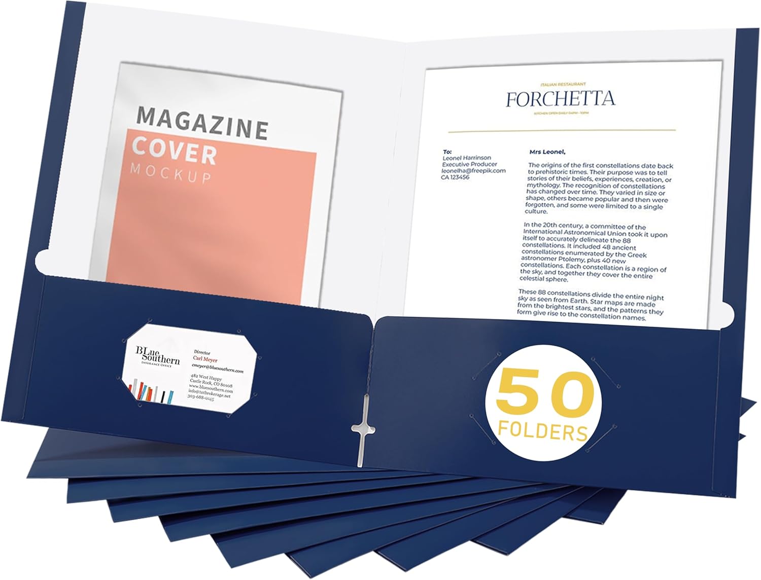 - PROFESSIONAL DESIGN: Two pockets provide storage space for paper, brochures, and more. Each folders for documents measures 9" x 11.5", with two 4" pockets, holds (over 100) sheets of paper, and has a universal business card holder on the right pocket.