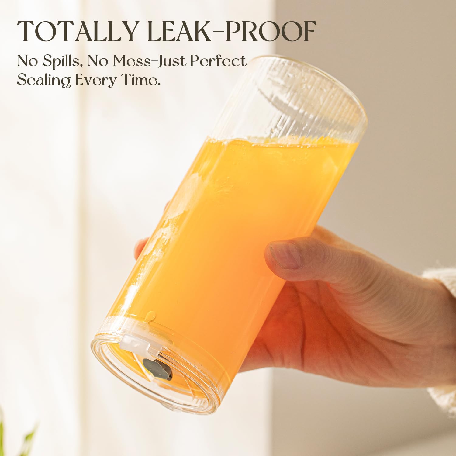 - 【Leakproof Lids for Spill-Free Drinking】 The silicone-sealed snap-on lids keep drinks secure, making these round drinking glasses ideal for travel, office, or outdoor use.