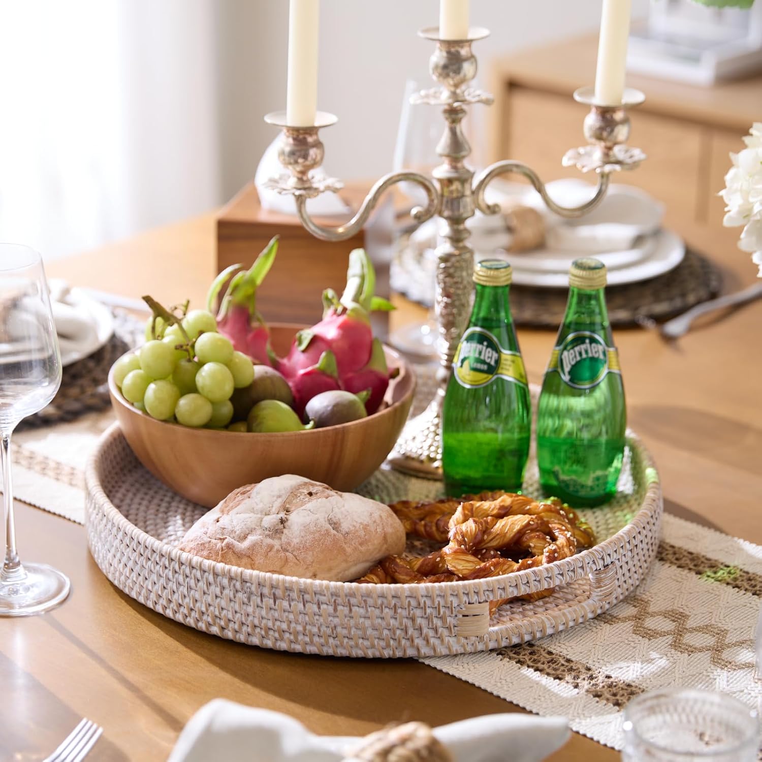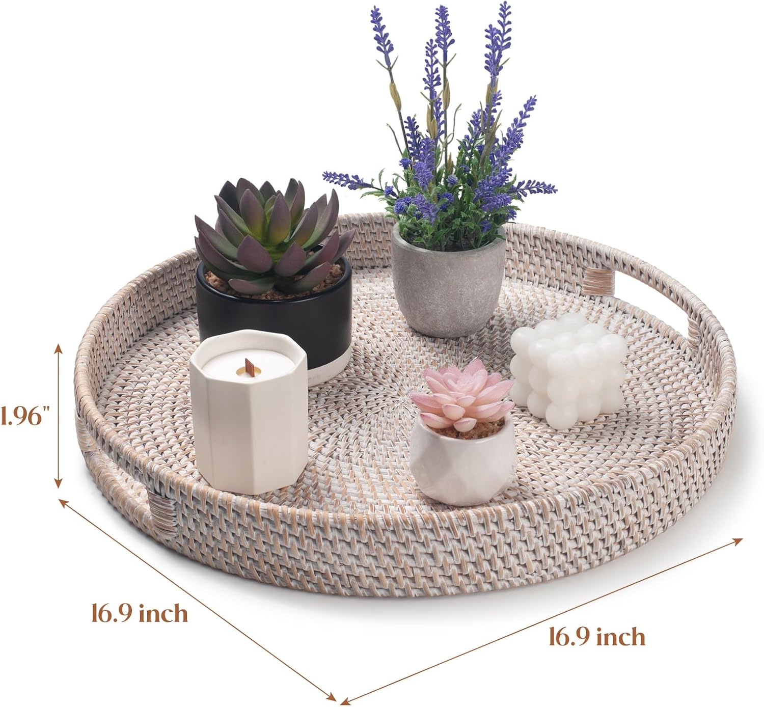 16.9 inch Round Rattan Tray, Woven Large Serving Tray with Handles, Wicker Serving Basket, Coffee Table Decor for Living Room, Whitewash