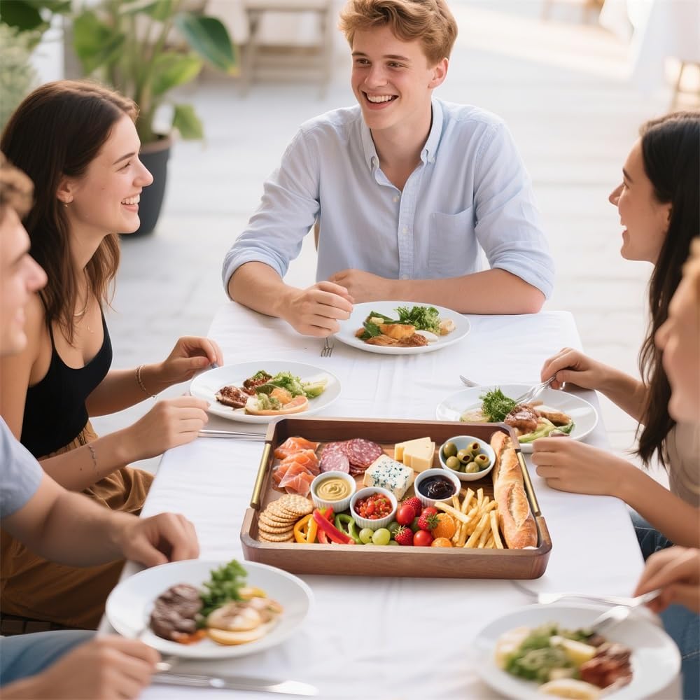 Create a warm and inviting dining space with wood furniture, linen accents, natural textures, and soft lighting.