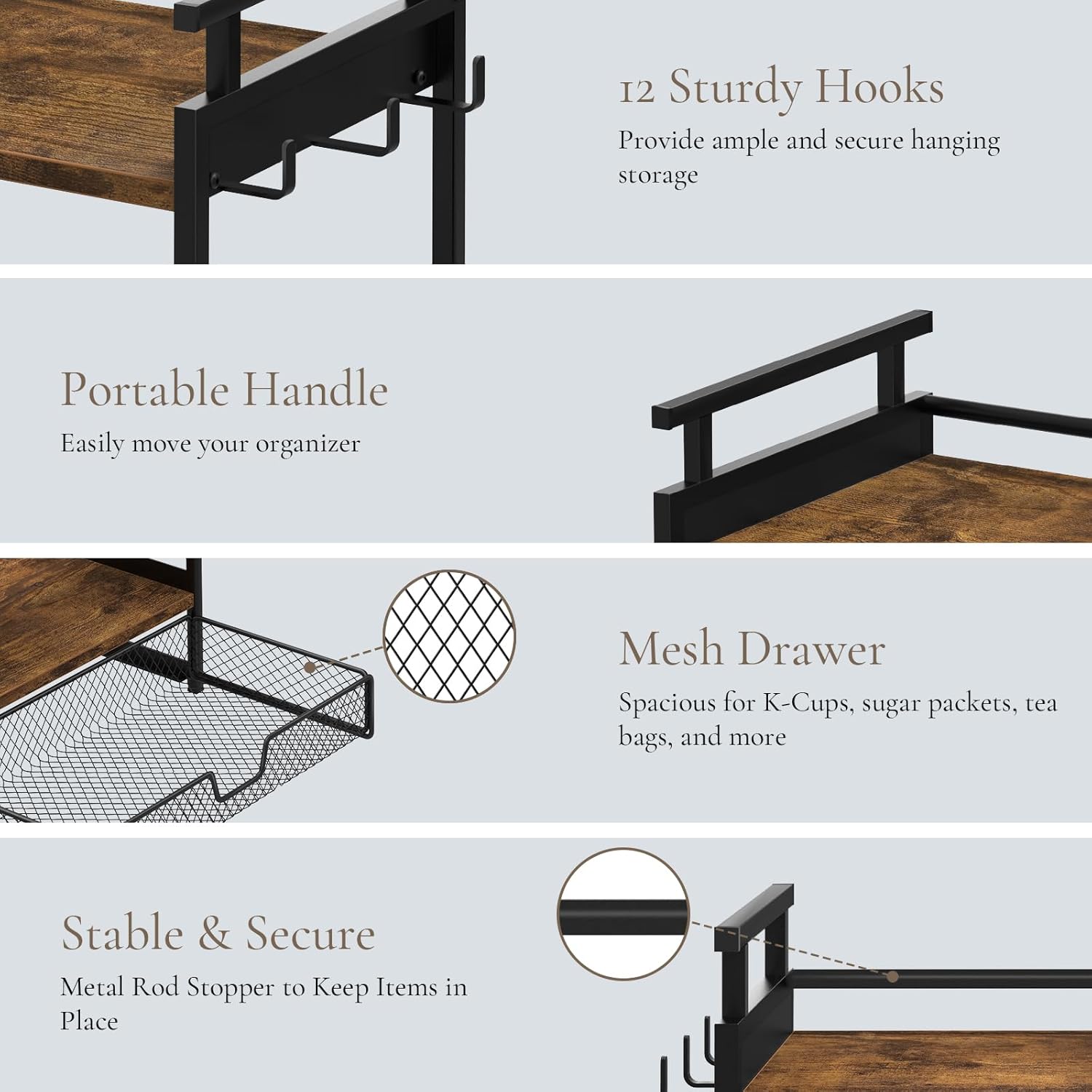 - 【Ample Storage Capacity】This coffee station organizer features three tiers of storage, including two open shelves and a coffee pod drawer with 12 mug hooks. It offers generous space for coffee mugs, pods, and accessories, while the drawer is ideal for storing small items like sugar packets, tea bags, K-cups, and more. This all-in-one organizer combines a mug holder, coffee bar organizer, and coffee pod drawer, helping you maximize space and keep everything neatly accessible.