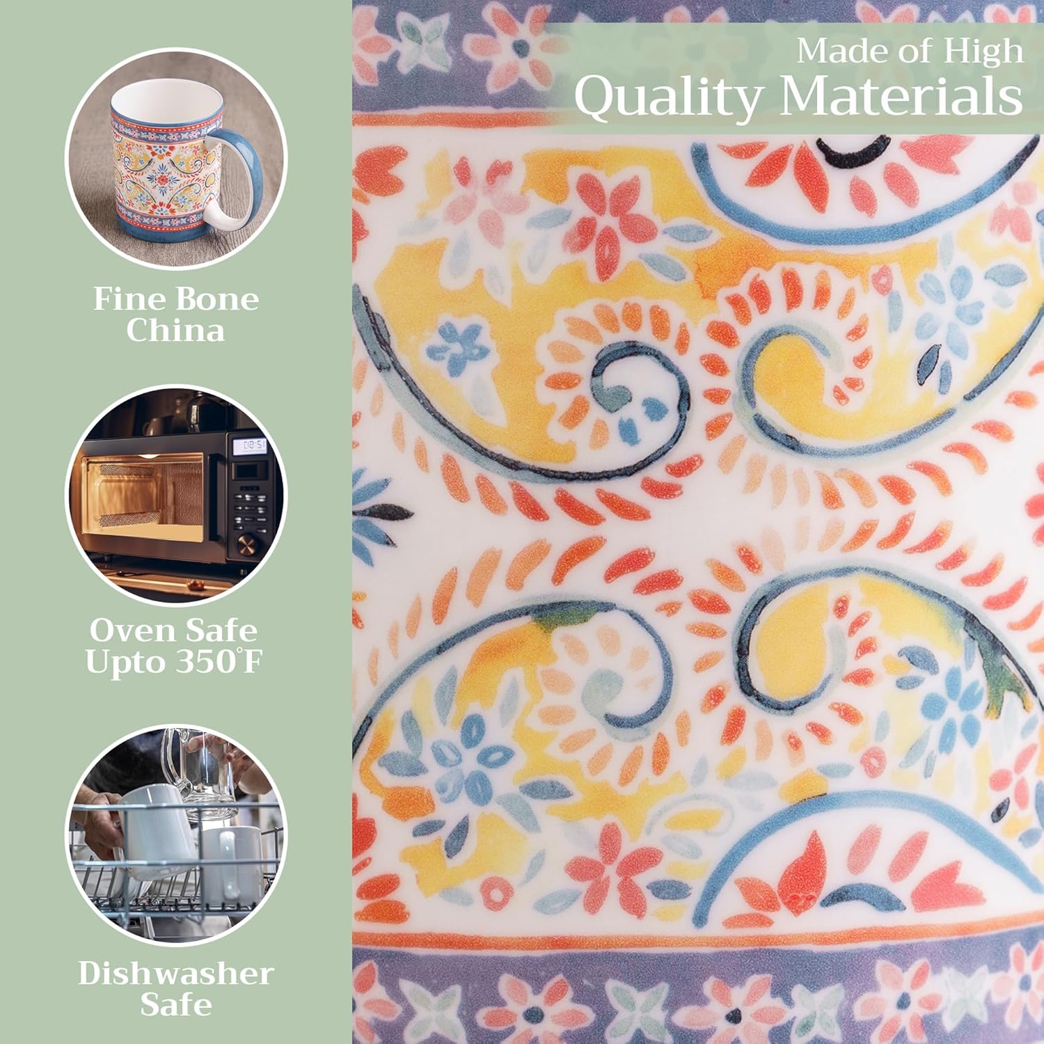 - EASY CARE & MAINTENANCE: Safe enough for Dishwasher Microwave Freezer. It is made of fine bone China and is oven safe to 350 Degree F