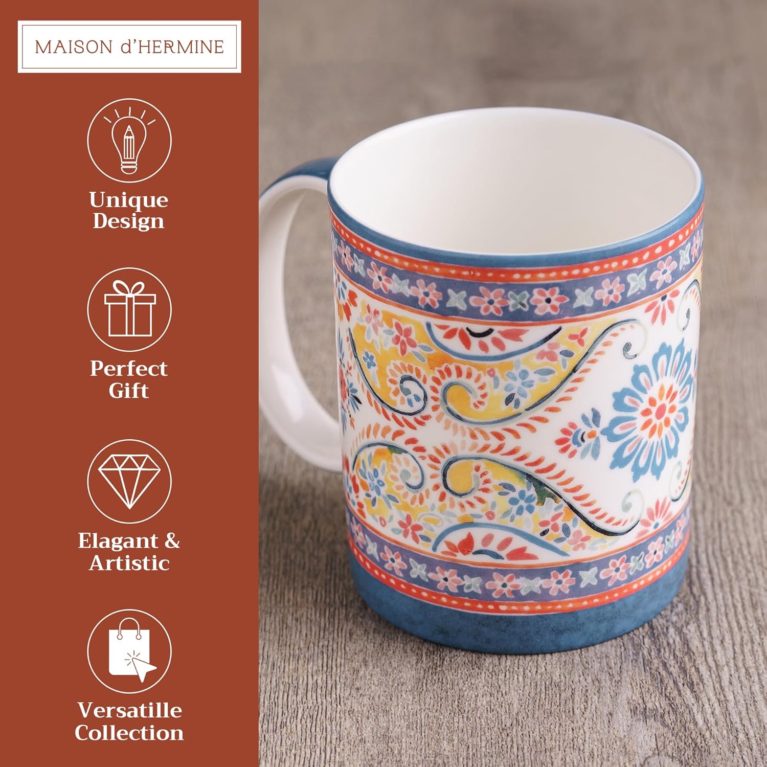 Maison d' Hermine Coffee Mug with Handles Fine Bone China Mugs Pack of One Tea Cups for Hot Beverages Cappuccino Latte Home Restaurant Office Perfect for Gift (Indian Floral - Butta, 15 Ounce)