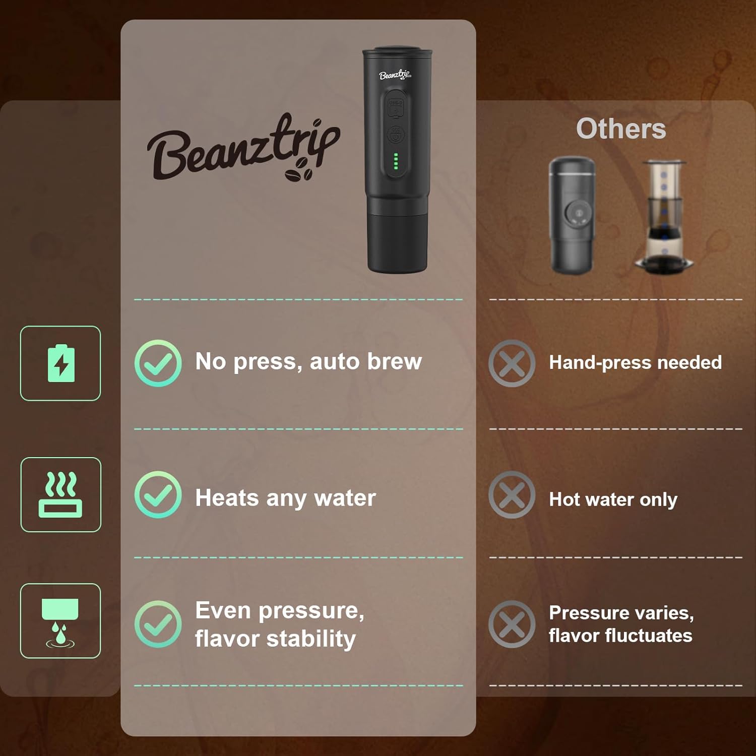 - 【Compatible with NS Capsules & Ground Coffee】No more compromises! Brew your favorite freshly ground coffee or use convenient coffee capsules (fits Nespresso capsule original pods). BeanzTrip portable espresso machine is perfect for coffee lovers who crave flexibility.