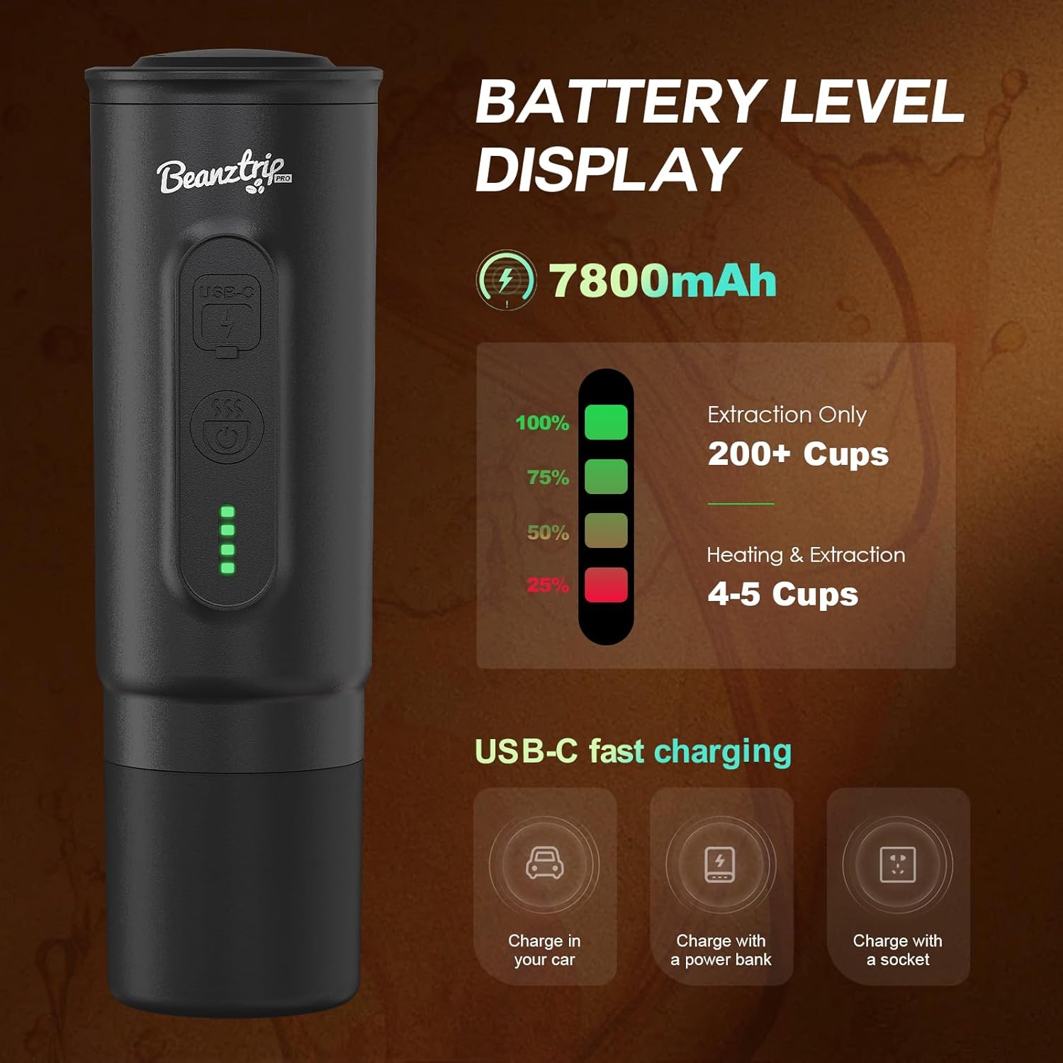 - 【Extended Battery Life】200+ cups per charge - engineered for outdoor! The high-capacity battery heats water for 200+ cups (pre-heated) or 4-5 full brew cycles (from cold to hot). BeanzTrip travel coffee maker is suatible for multi-day trips without power sources.