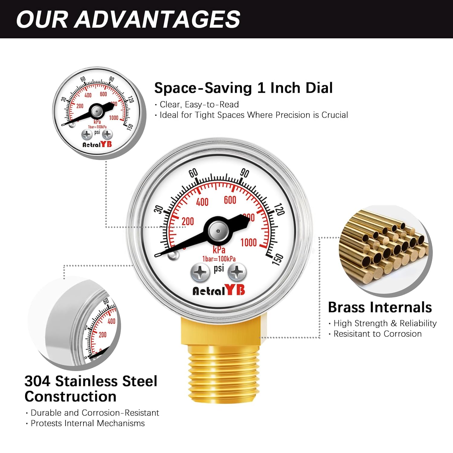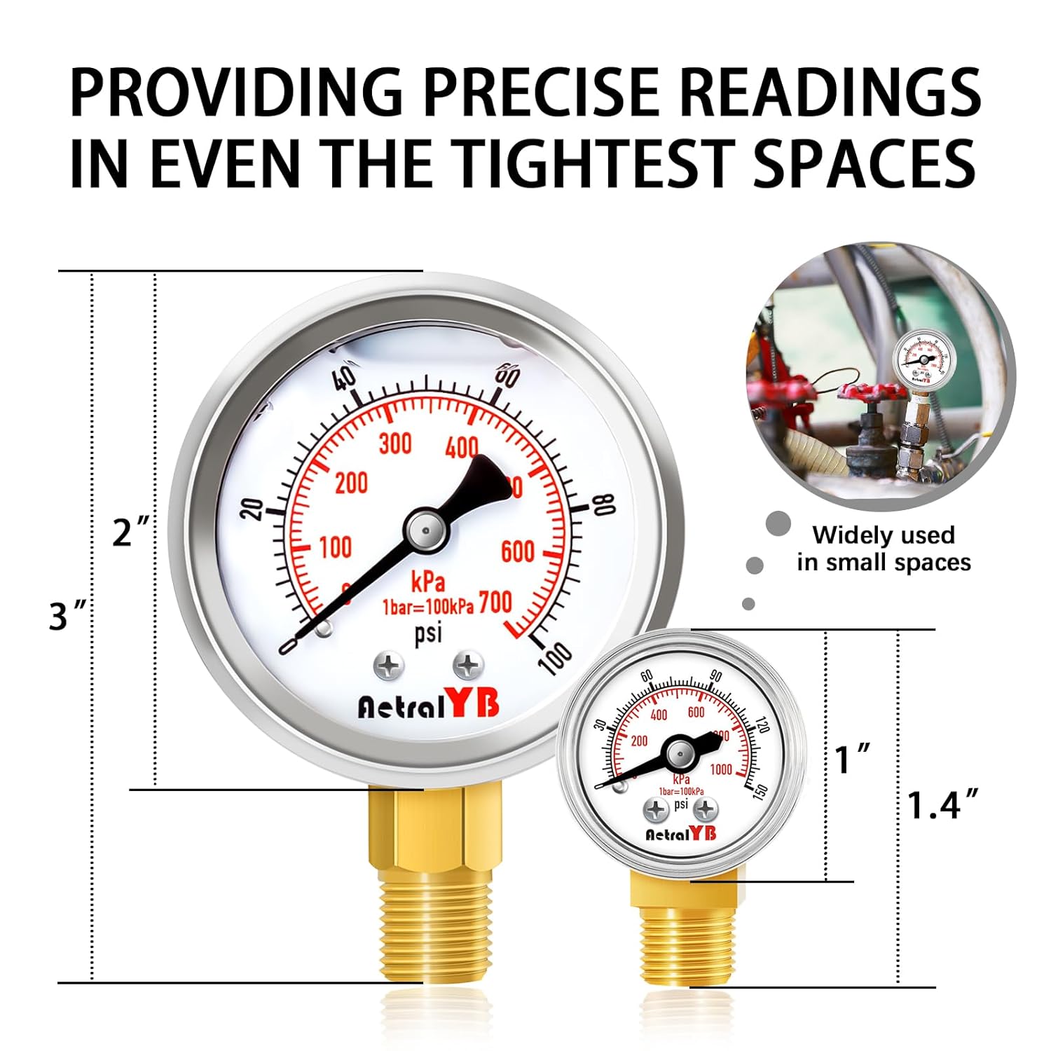1-Inch Mini Pressure Gauge, 0-150 PSI / 0-1000 kPa, High-Pressure Dual-Scale Air Pressure Gauge, Stainless Steel Case, 1/8” NPT Bottom Mount for Hydraulics and Compressed Air Systems