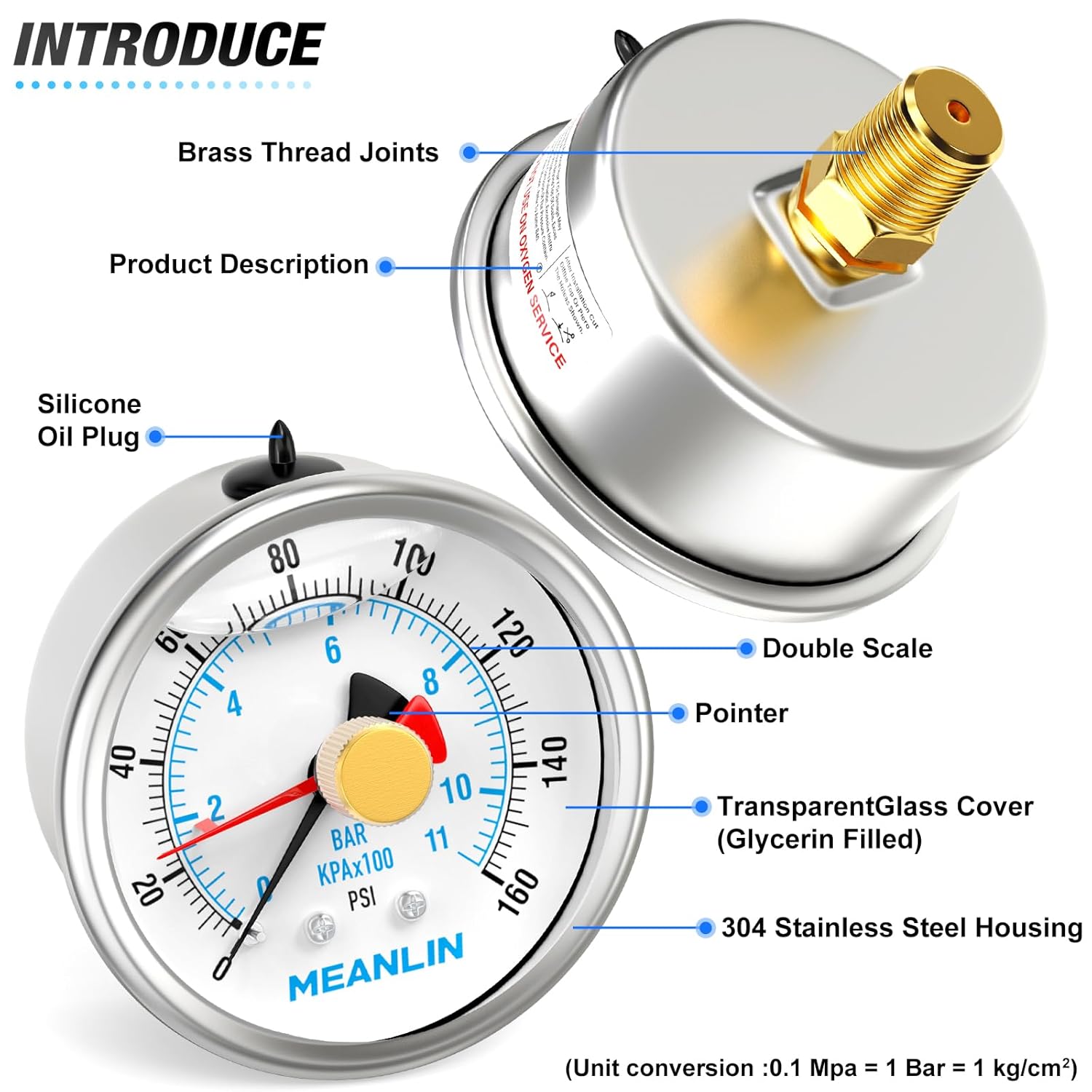 MEANLIN MEASURE 0~160Psi Stainless Steel 1/4" NPT 2.5" FACE DIAL with Reset Pointer Liquid Filled Pressure Gauge WOG Water Oil Air, Back Mount, with Brass Hex Bushing