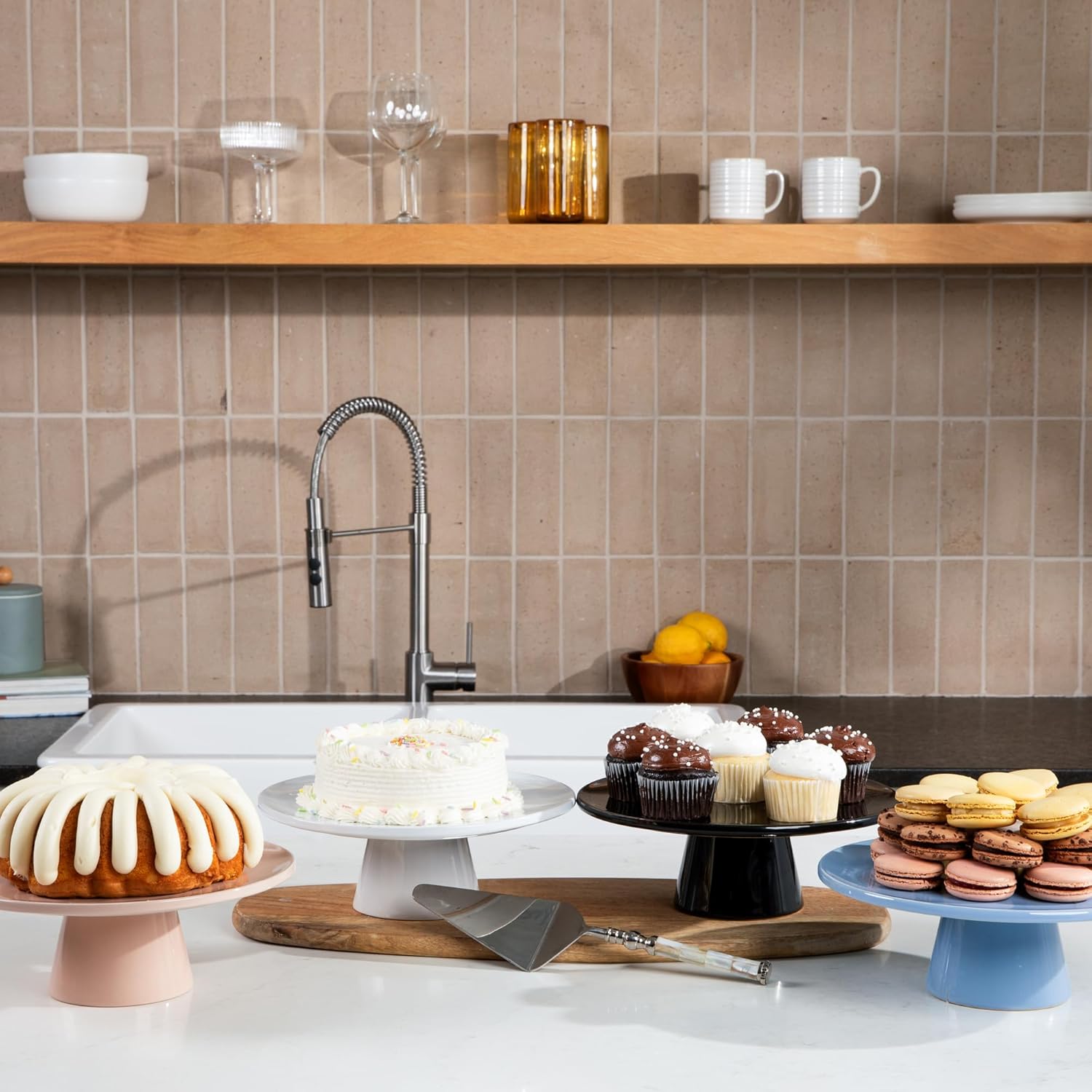 - MODERN & ELEGANT PEDESTAL CAKE STAND: 10" wide, 3.5" high ceramic cake stand with a gloss finish, perfect for stylish dessert displays.