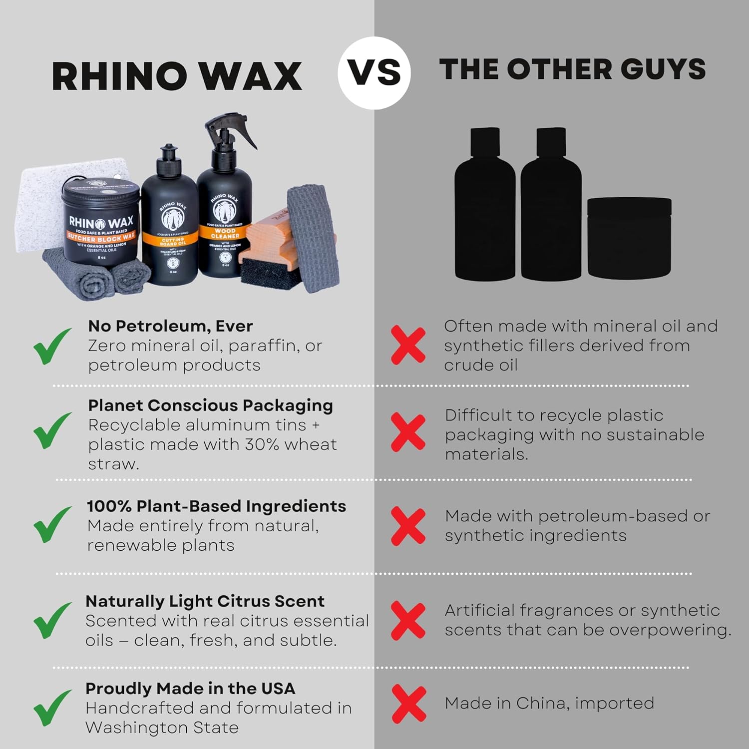 - Visible Results: Regular use of Rhino Wax Wood Cleaner Spray, Cutting Board Oil and Cutting Board Wax ensures the quality and beauty of your wood cutting boards, butcher blocks and kitchen tools