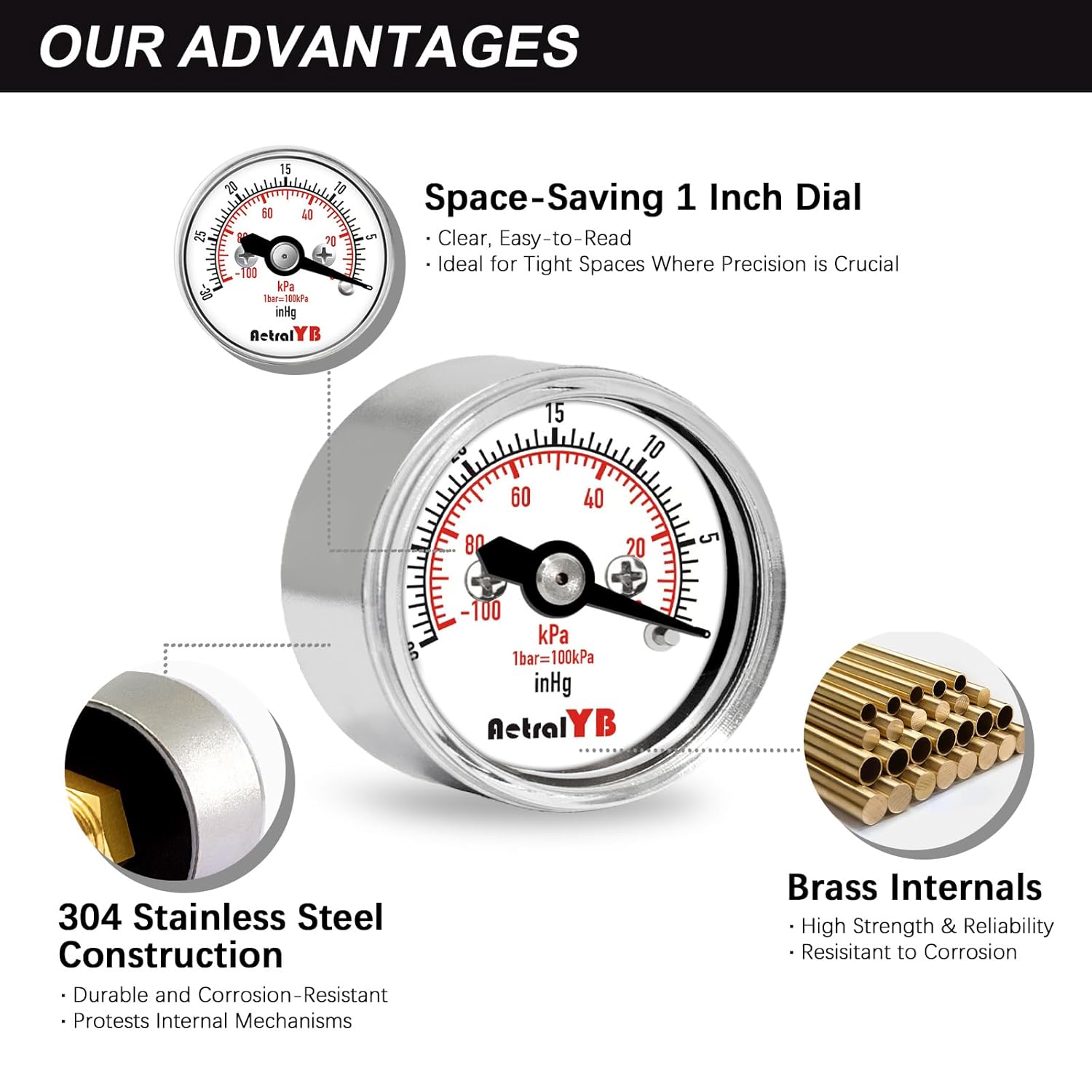 1inch Vacuum Pressure Gauge, 30Inhg-0/-100Kpa-0,1" Dial, 1/8 NPT Back Mount, 304 Stainless Steel Case, Brass Internal, for Vacuum Test