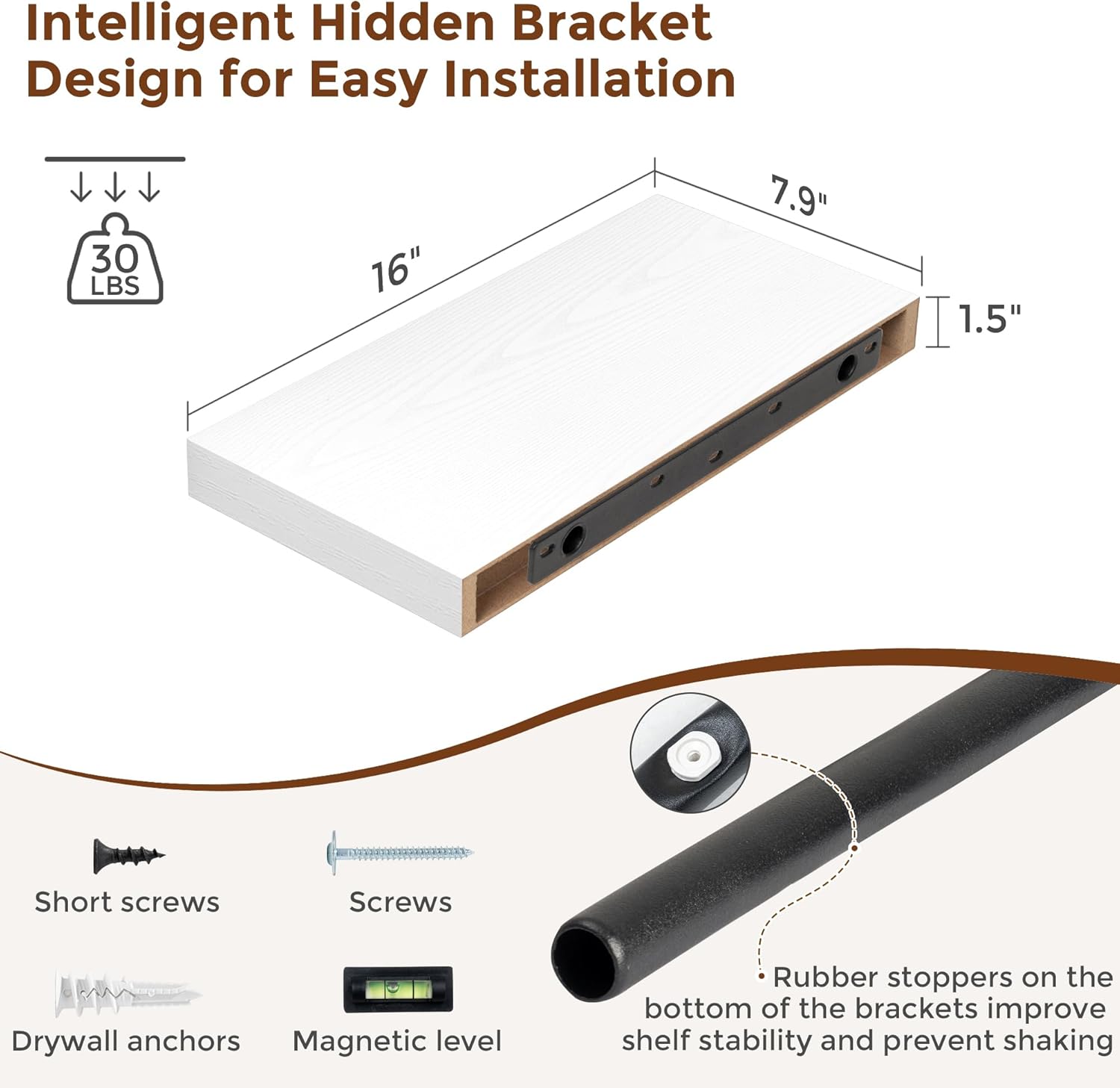 - 【Sturdy Support】Make the most of your wall space with our 16 x 8 inch white floating shelves for wall for room wall. At 1.5 inches thick, they offer sturdy support for your plants and decorative pieces. Each shelf can hold up to 30 lbs, ensuring your items never sag or fall.