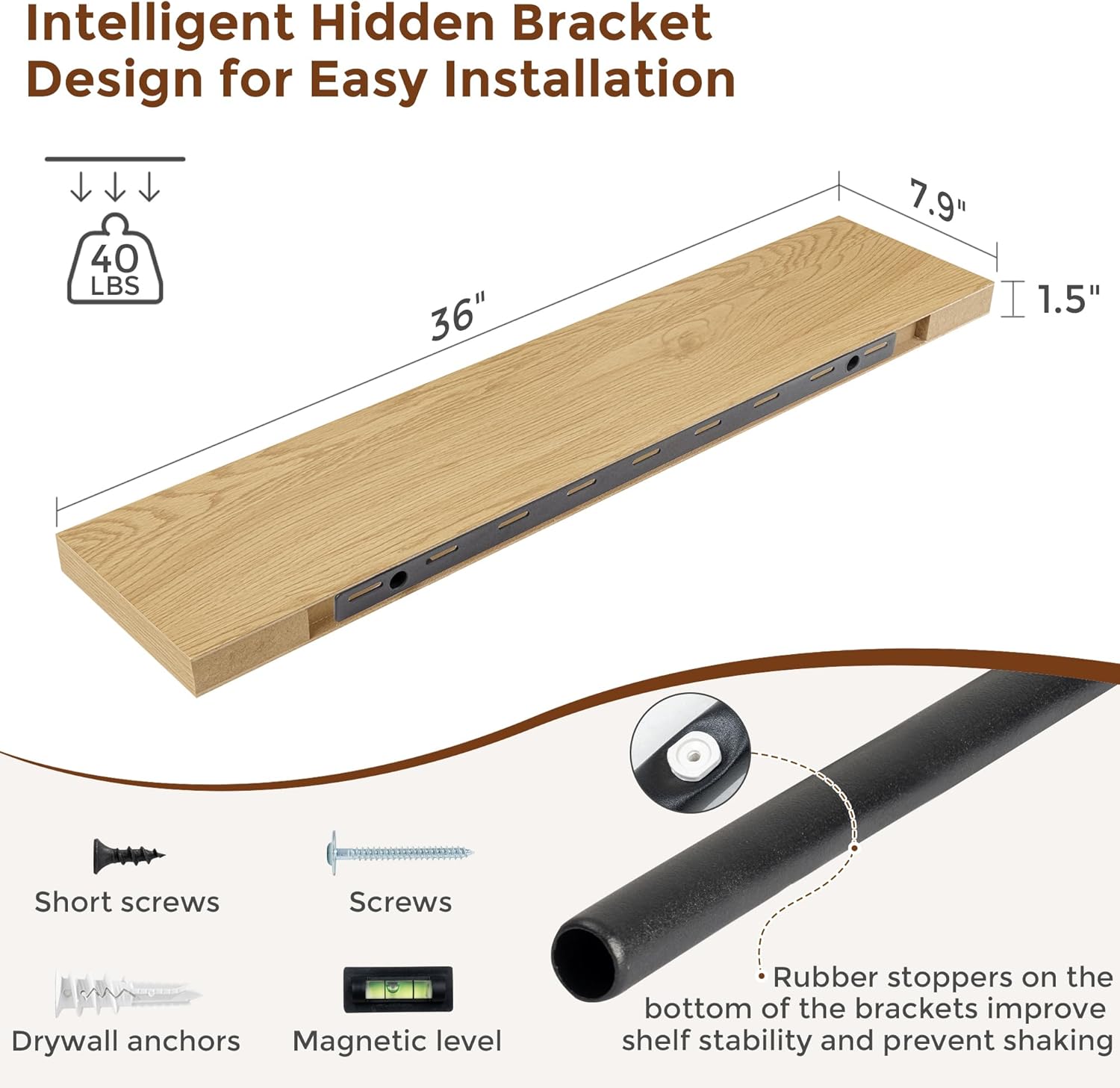 - 【Easy To Install】This oak floating shelves not only come with stainless-steel galvanized invisible brackets, but also equipped a fixing screw at the bottom to fix the shelf on the support rod, which solves the problem of sliding and is not easy to damage, and can be used for a long time. Instructions, magnetic level, drywall anchors, and screws included.