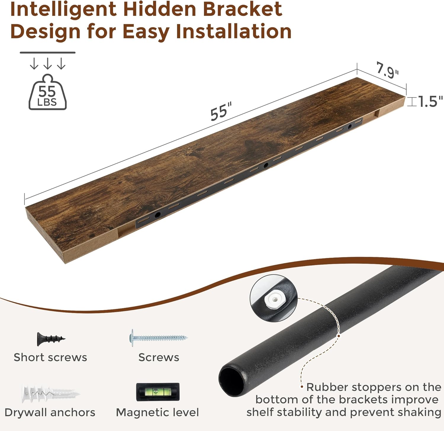 Heimlove 55 Inch Floating Shelves for Wall 8 Inch Deep Rustic Brown Shelves Set of 2,Wall Mounted Rustic Wood Long Floating Shelf,Large Extra Display & Storage Shelf with Invisible Brackets