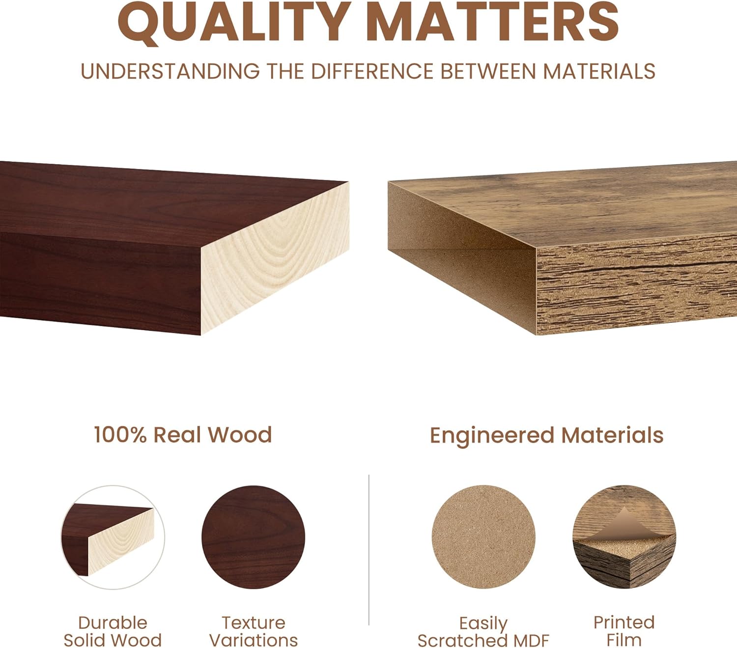 - 【SOLID WOOD FLOATING SHELVES】These wooden shelves are made of real solid Paulownia Wood with natural wooden node and grain, We deliberately retain the wood texture on the surface to create a natural and warm feelings that suit your various home decorations. The lightweight wood material is specially selected, which won't add too much burden to the wall, is better for wall-mounted stability.
