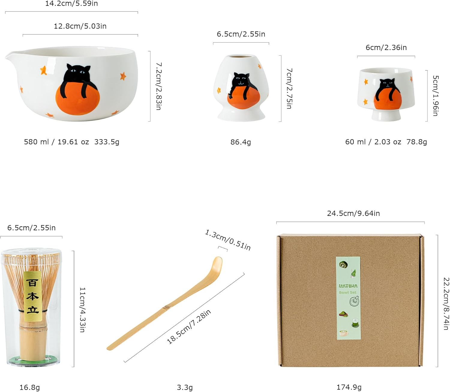 - Adorable Black Cat Design – Featuring a whimsical black cat holding an orange ball, this unique matcha set combines traditional Japanese aesthetics with a playful and charming touch, making your tea moments more delightful.