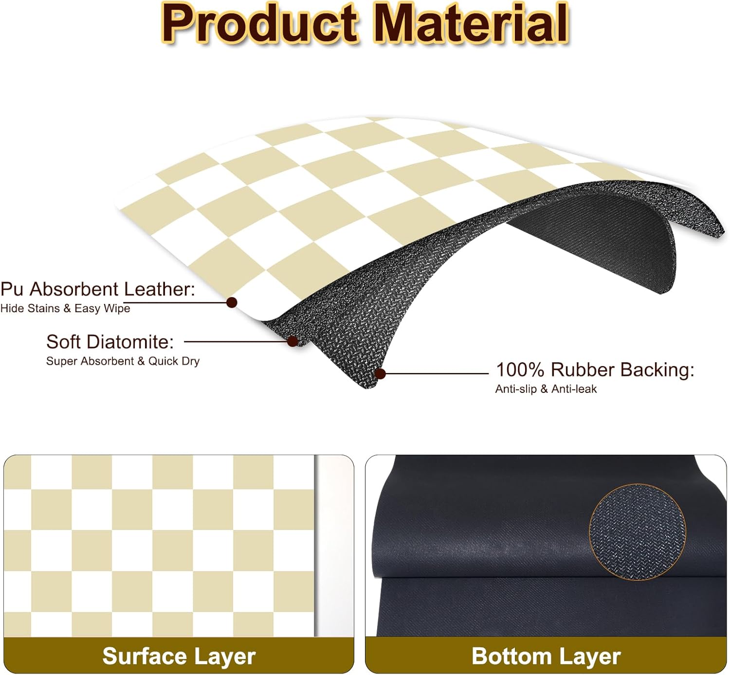 Dish Drying Mat for Kitchen Counter, 16.5’’ X 31.5’’ Absorbent Coffee Mat, Checkered Coffee Bar Mats for Espresso Machine Station, Hides Stains, Rubber Backed Dish Drying Pad, Beige & White