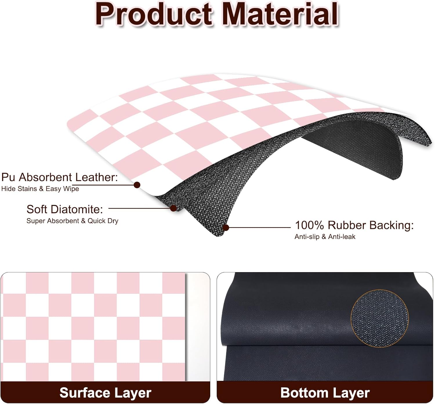 Dish Drying Mat for Kitchen Counter, 16.5’’ X 27.6’’ Checkered Large Coffee Station Mat, Super Absorbent Fit Under Coffee Maker Pad, Espresso Machine Mats, Drainer Mat Easy Clean, Pink & White