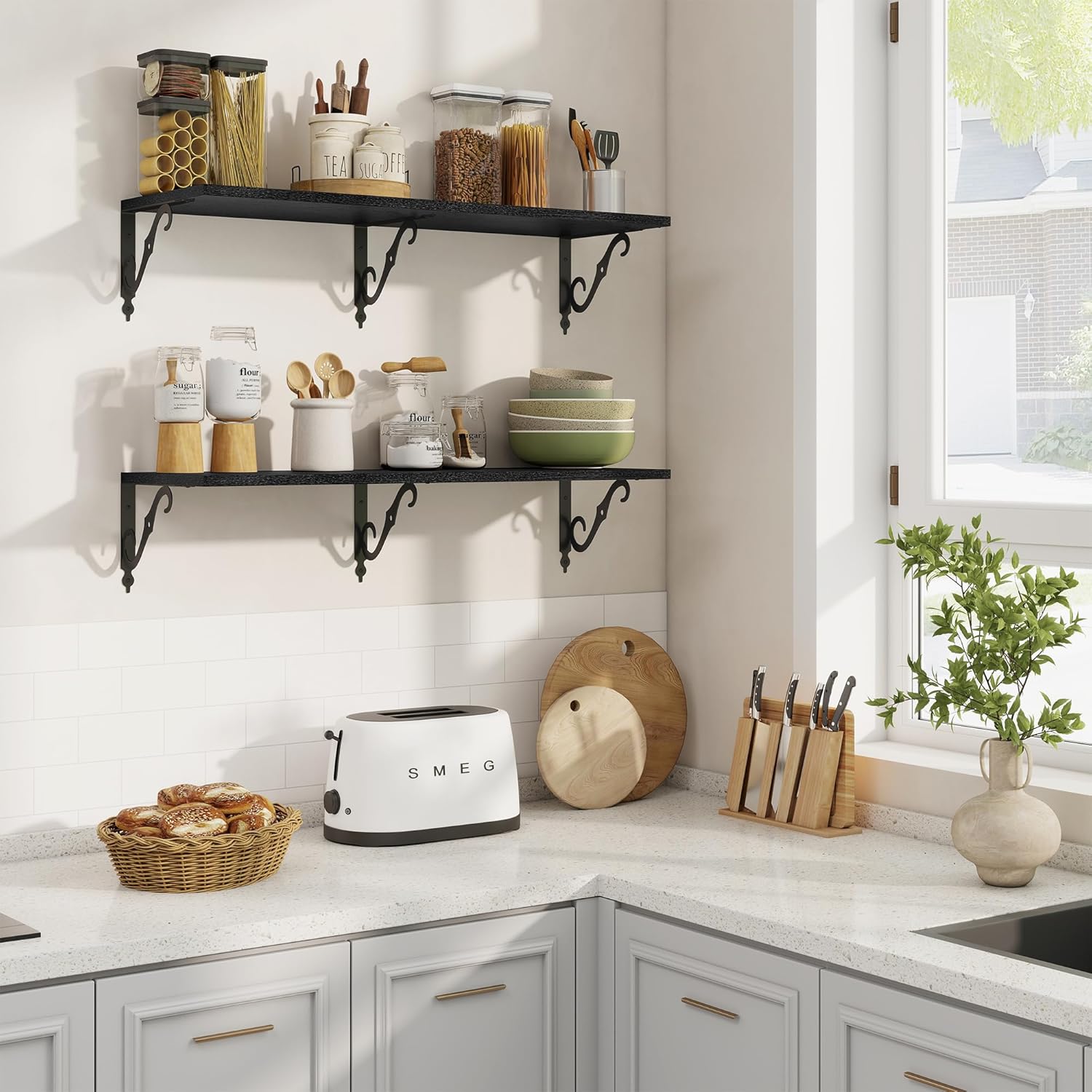 - 12 Inch Deep Floating Shelves: Our rustic deep floating shelves are made of high-quality particle board and sturdy brackets. The classic S-shaped brackets are designed to prevent sagging and ensure long-lasting stability. All edges are carefully sanded for a smooth finish