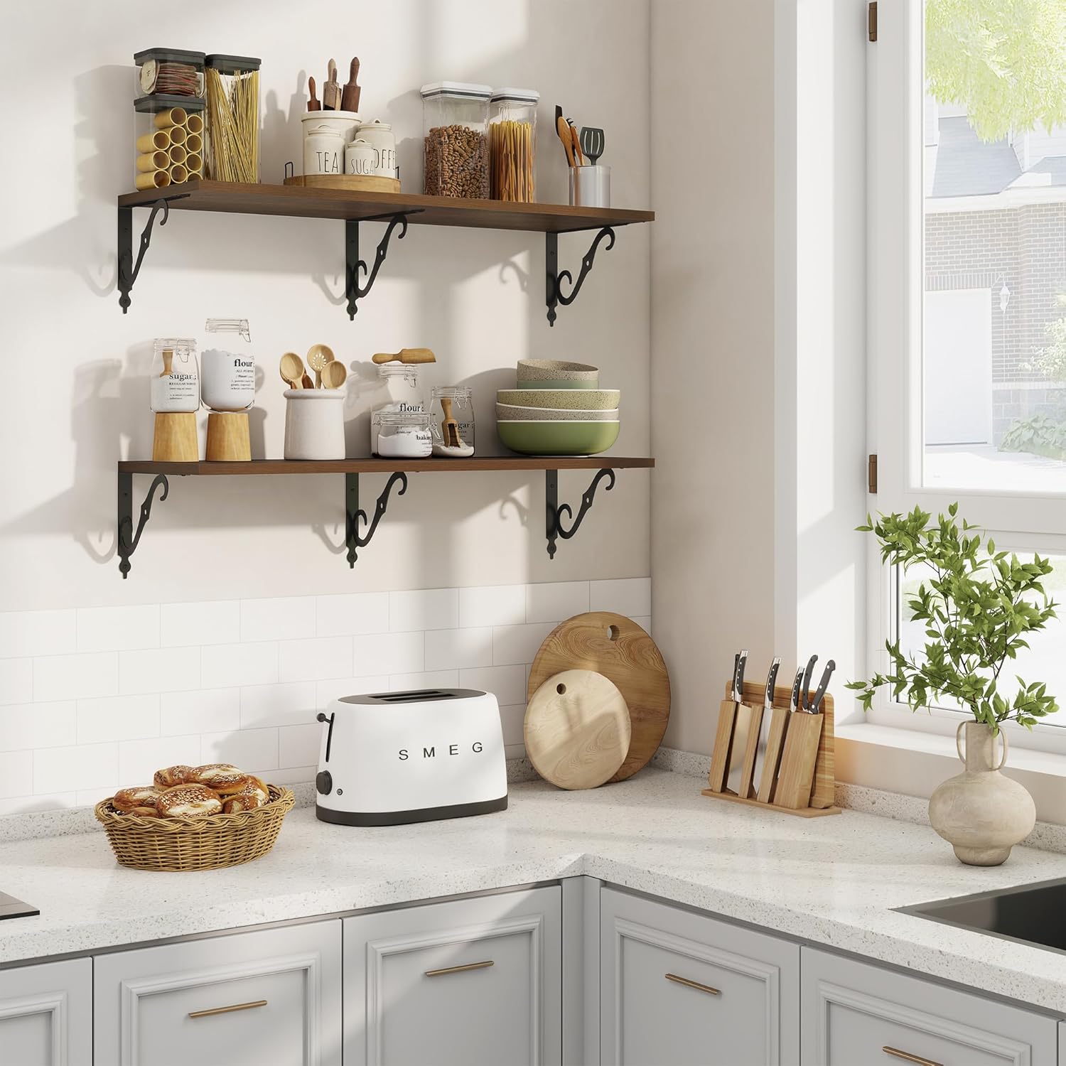 - Perfect Home Decor: This wood shelf fits rustic style, or vintage style home decor, rustic wood grain and exquisite S-shaped brackets will make your home full of modern and elegant romance. Our floating shelf makes full use of the wall, and let your room and bathroom look so cute. The bracket can be installed above or below the board according to space and usage to create your unique home style