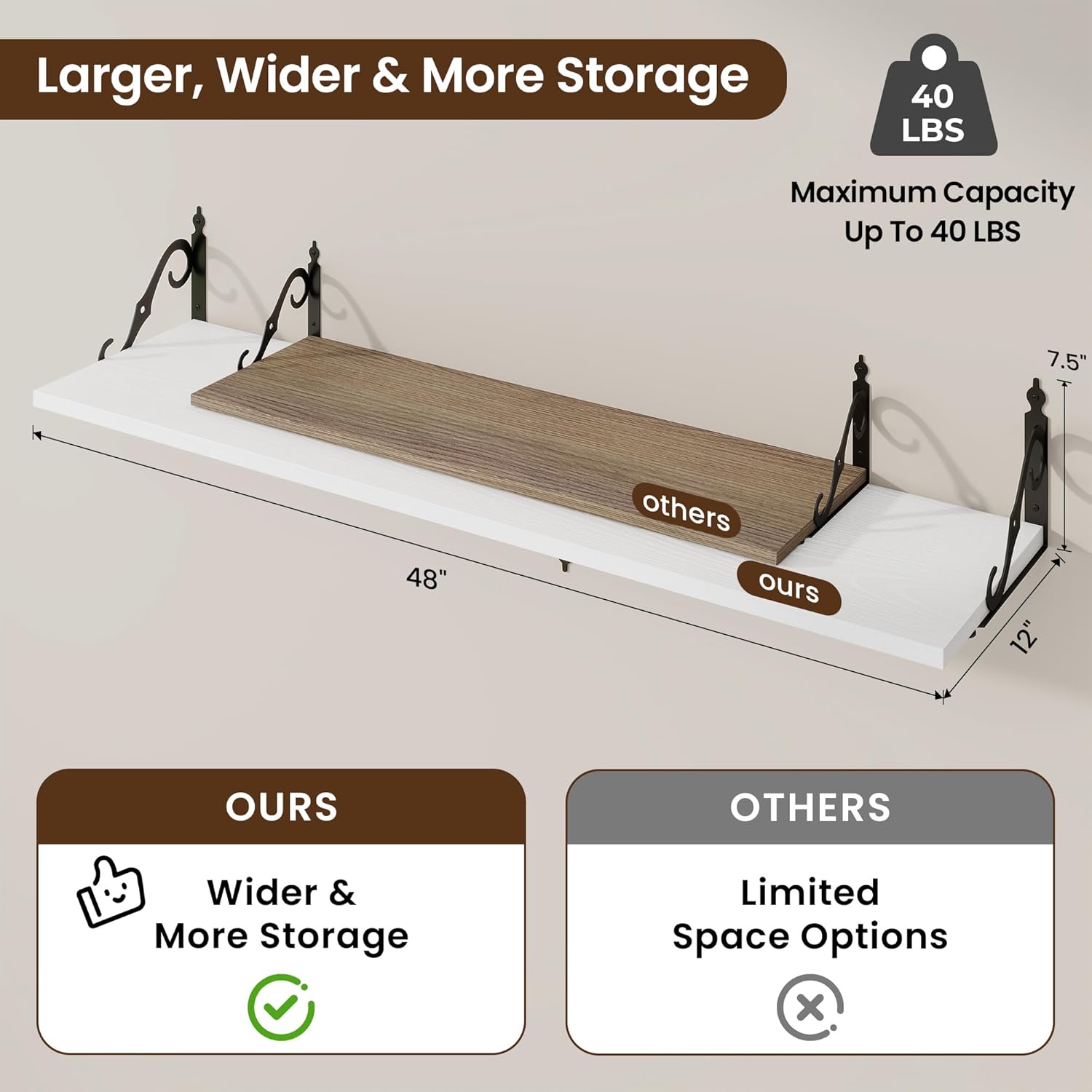 - 12 Inch Deep Floating Shelves: Our rustic deep floating shelves are made of high-quality particle board and sturdy brackets. The classic S-shaped brackets are designed to prevent sagging and ensure long-lasting stability. All edges are carefully sanded for a smooth finish