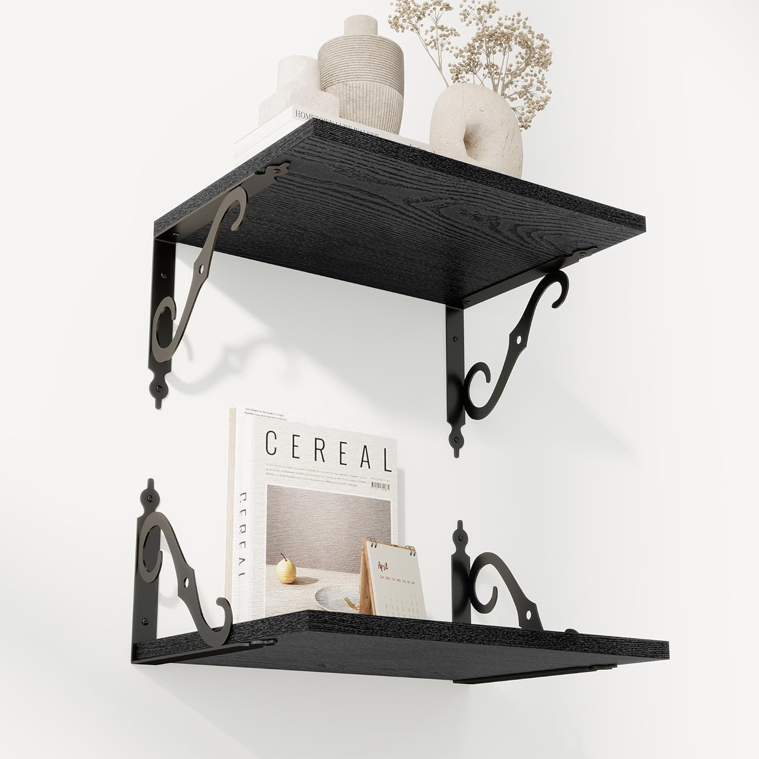 - 12 Inch Deep Floating Shelves: Our rustic deep floating shelves are made of high-quality particle board and sturdy brackets. The classic S-shaped brackets are designed to prevent sagging and ensure long-lasting stability. All edges are carefully sanded for a smooth finish