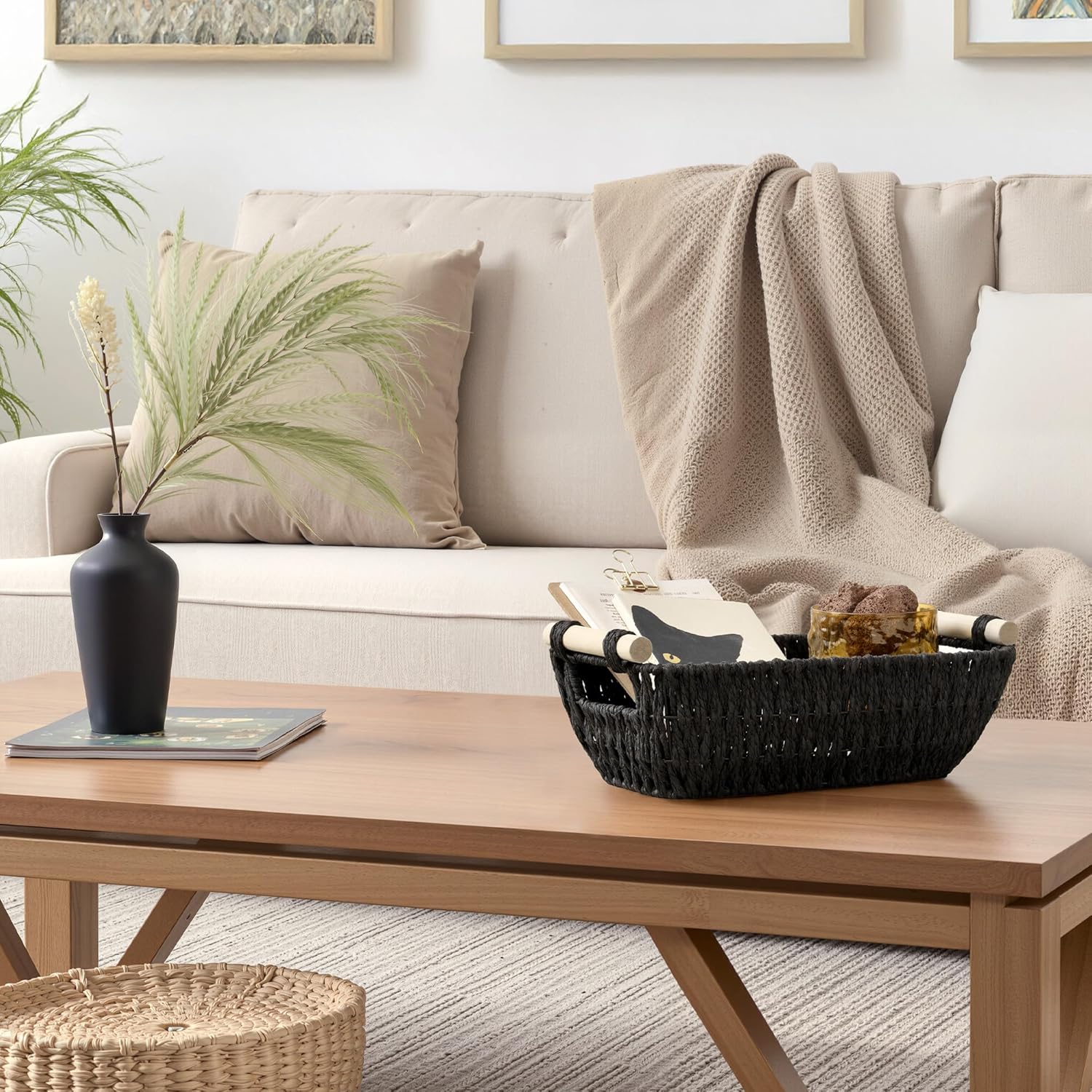 StorageWorks Black Wicker Storage Basket for Organizing with Wooden Handles, Small Woven Basket for Bathroom, Toilet Paper, 2-Pack