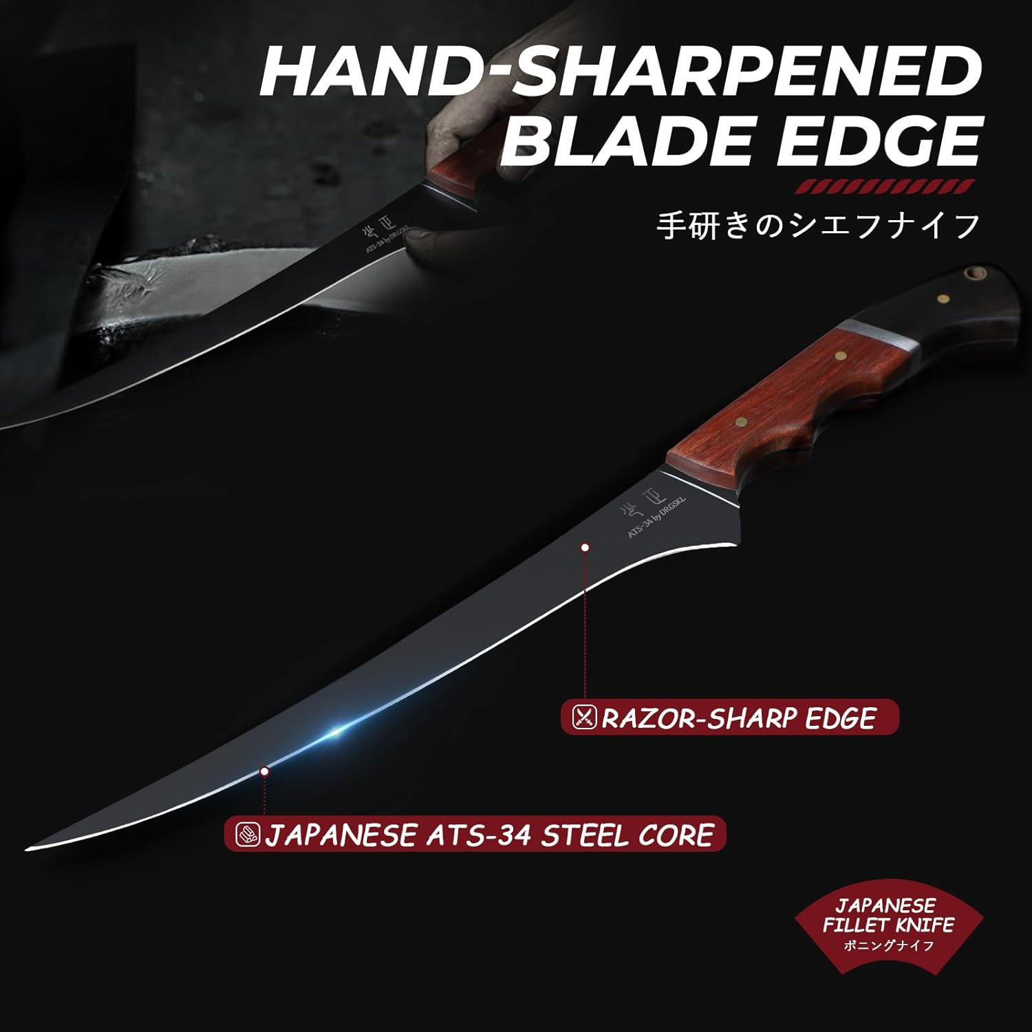 - ATS-34 Steel – Forged with Traditional Japanese Precision.This Fillet Knife is forged using time-honored Japanese craftsmanship and premium ATS-34 steel, a high-carbon steel known for its hardness and fine grain. Sharpened through a multi-stage wet grinding process—(Mizukensaku)—the edge achieves superior precision and lasting sharpness. This meticulous hand-forging reflects the spirit of Japanese blade-making, where durability meets refined artistry.