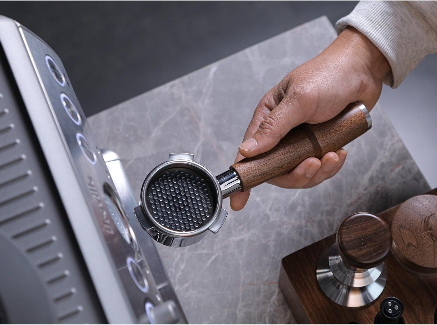 - Made from solid natural walnut and precision-machined components, this portafilter delivers a professional feel with long-lasting durability. Includes a high-quality 18–21g double shot basket to ensure even flow and rich crema