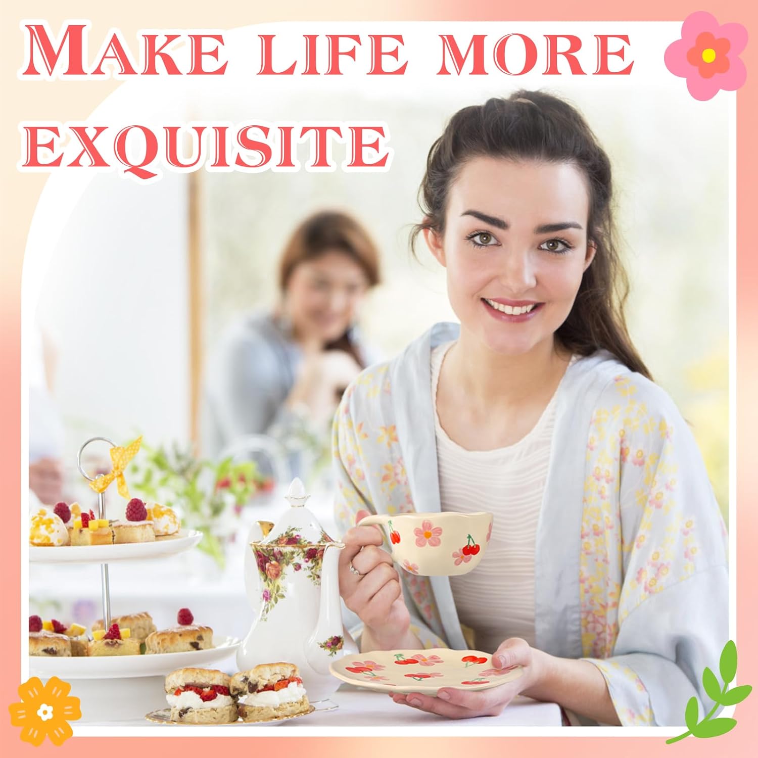 Cappuccino Cups with Saucers 8 oz Latte Art Cup Ceramics Coffee Mugs Irregular Aesthetic Flower Cups for Espresso, Double Shot, Americano, Latte, Tea - Microwave and Dishwasher Safe (Pink Cherry)