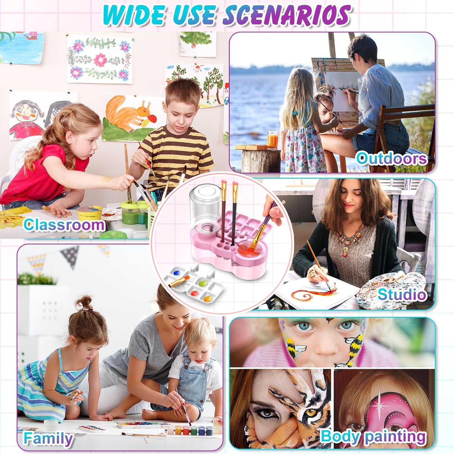 - 【QUALITY MATERIAL】Our paint brush cleaner is designed with high quality ABS plastic. It is more durable, sturdy, unbreakable and long-lasting.It is suitable for use in classrooms, art studios, homes, and outdoors, ensuring that you always have clean brushes during the painting process.