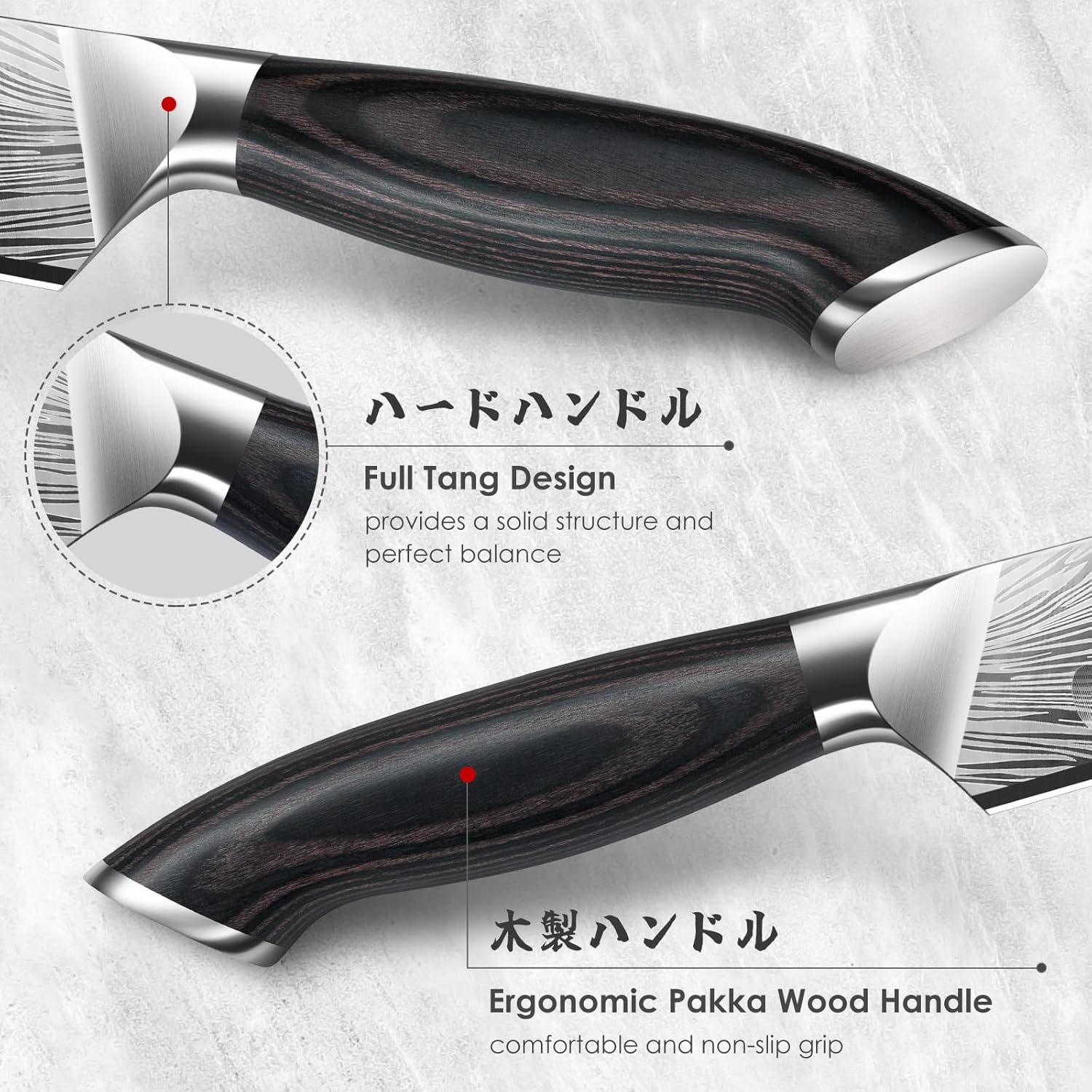 - [Fashion Laser-Etched Professional Aesthetic] This professional slicing knife features a design that combines traditional aesthetics with modern elements. Engraving a stylish texture pattern on the blade's surface by laser makes knife look more advanced and fashional. NOTE: THIS IS NOT DAMASCUS KITCHEN KNIFE