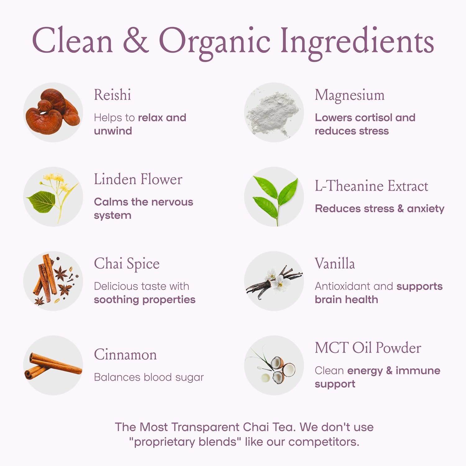 - Purpose-Crafted Formula: Each ingredient we’ve added to our chai tea powder serves a specific purpose in providing calm and relaxation. While our mushroom chai is not a sleep aid, it can help provide the peace and calm that should make falling asleep easier. Wind down tonight and make tomorrow yours.