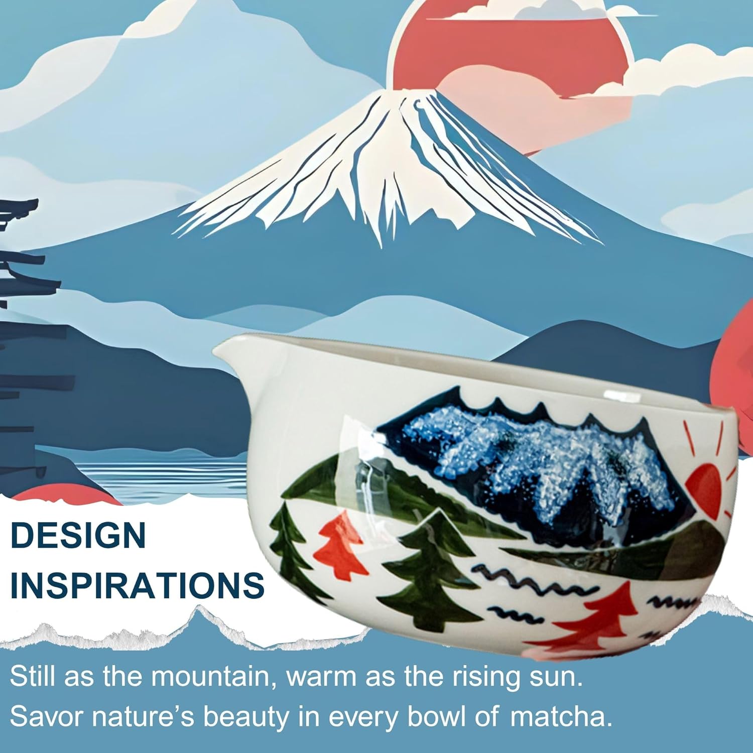 Fuji Mountain Matcha Bowl Set – 6-Pcs Hand-Painted Scenic Japanese Tea Ceremony Kit | Matcha Bowl with Spout, 2 Cups, Bamboo Whisk, Scoop & Whisk Holder | Gift for Tea Ceremony Lovers