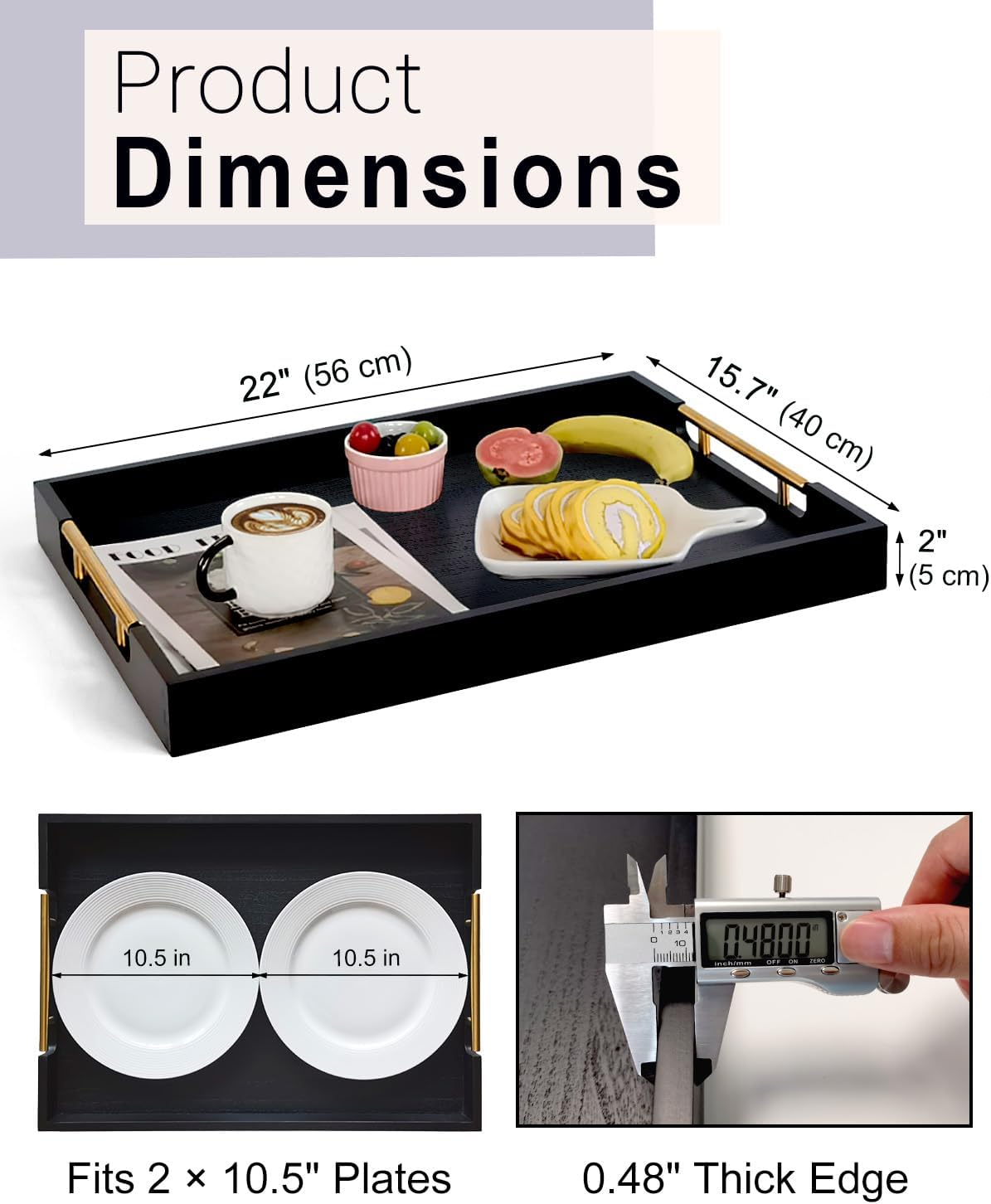 22 Inch Rectangle Black Ottoman Tray with Gold Metal Handles, Extra Large Wooden Serving Tray for Living Room, Coffee Table, Kitchen & Hosting